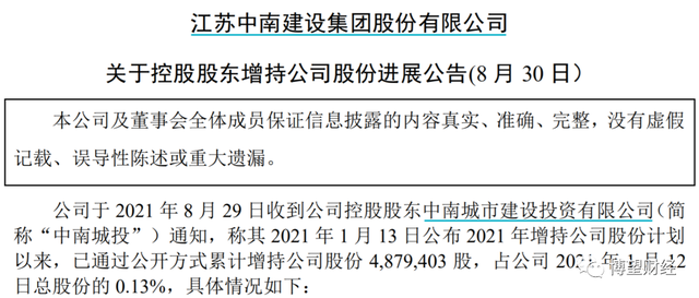 8月30日,中南建设发布关于控股股东增持股份进展公告称,8月29日收到控股股东中南城建通知,称其1月13日公布2021年增持中南建设股份计划以来,已通过公开方式累计增持中南建设股份487.94万股,占当时总股份的0.13%。