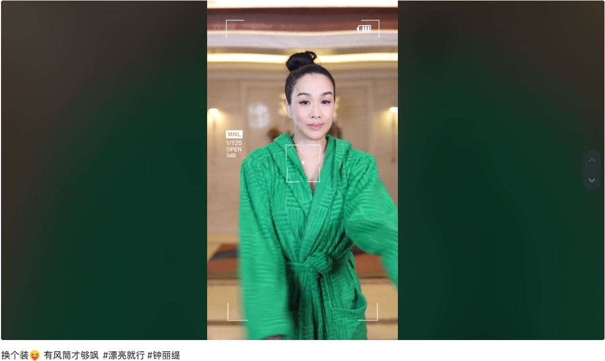 视频中,50岁的钟丽缇素颜出镜,扎起丸子头戴着十字钻石耳钉,很是亮眼优雅。她裹紧亮绿色条纹浴袍,随着音乐节奏慢慢地扭动腰肢。