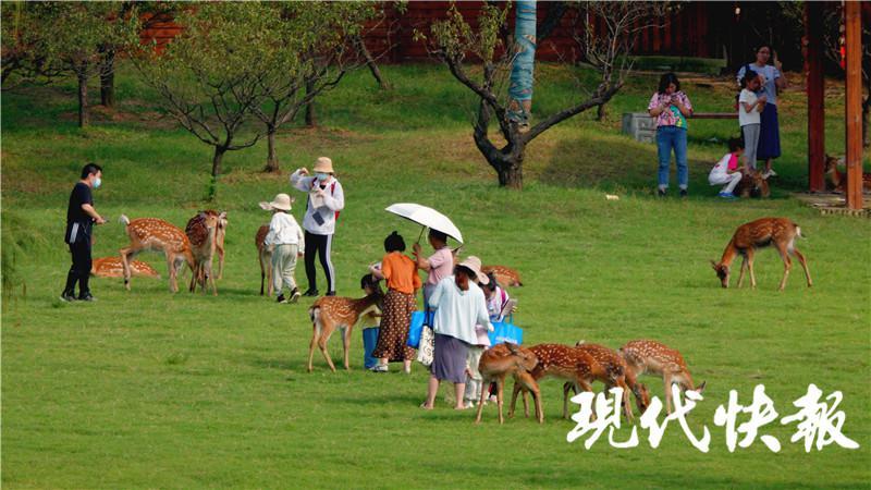 逛完展览,想与山间精灵们来一场亲密接触?目前,明孝陵景区内的长生鹿苑也已经恢复开放。可爱的小鹿们或奔跑于林间,轻盈动感,或蜷缩在树下休息,不时抬起头吃上两片树叶,或伸长脖子求喂食。现代快报记者看到,不少萌娃拿着小鹿喜爱的胡萝卜,正在与它们亲密互动,小鹿俯下身子的样子萌翻众人。