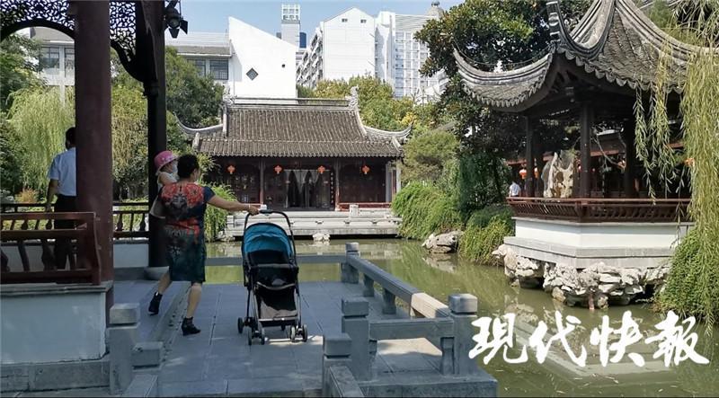 眼下,瞻园里仍是一片翠绿,绿荫映朱漆,曲径通幽间,假山林立,水面澄清,颇有江南古韵。在园中凉亭,不少推着婴儿车的游客正坐着乘凉、小憩,不时传来孩子们的欢声笑语。