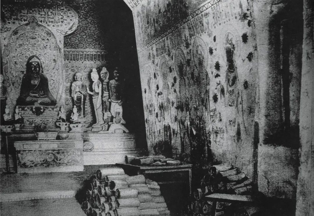 1907年莫高窟藏经洞以及摆在洞窟甬道上的经卷