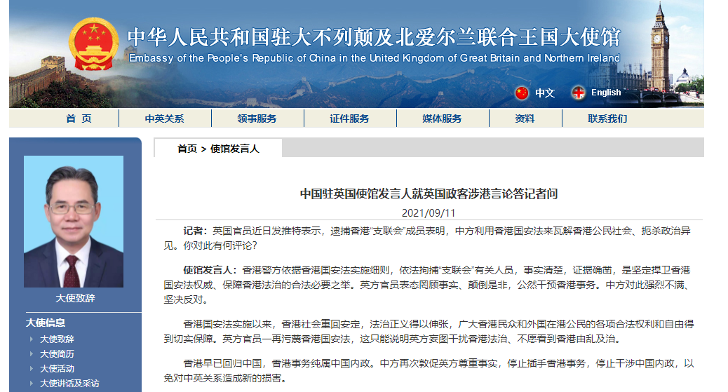 海外网9月11日电 据中国驻英国大使馆网站消息,中国驻英国使馆发言人就英国政客涉港言论答记者问。