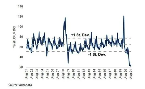 美国汽车经销商的库存已经历史最低水平降至更低,从今年7月的略高于 100 万的库存降至低于100万。然而去年 8 月份的库存水平还在 250 万辆左右,可见库存下降幅度之大。鉴于汽车需求强劲、持续的供应链挑战(特别是半导体芯片短缺),再加上当前的国际运输限制,库存恢复到正常水平在短时间内难以实现。