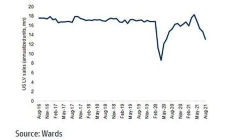 美国轻型汽车销量在今年 8月继续下滑,同比 2020 年 8 月约 1530 万辆的销售额下滑至 1310 万辆,跌幅 15% 左右,较7 月的约1460 万辆相比大幅下降。与上个月一样,销量下滑的主要原因是汽车库存水平持续下滑。