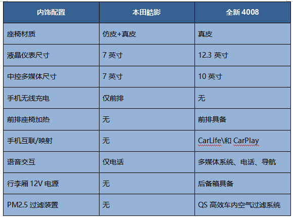 全新4008的优势是提供了感应式电动后尾门、更大的12.3英寸的液晶仪表+10英寸的中控大屏(本田为双7英寸),前排座椅加热、AQS高效车内空气过滤系统。小的配置优势是全新4008具备语音交互功能,支持CarLife\CarPlay。如果非要权衡配置的话,全新4008在科技感和便利性方面更有优势。