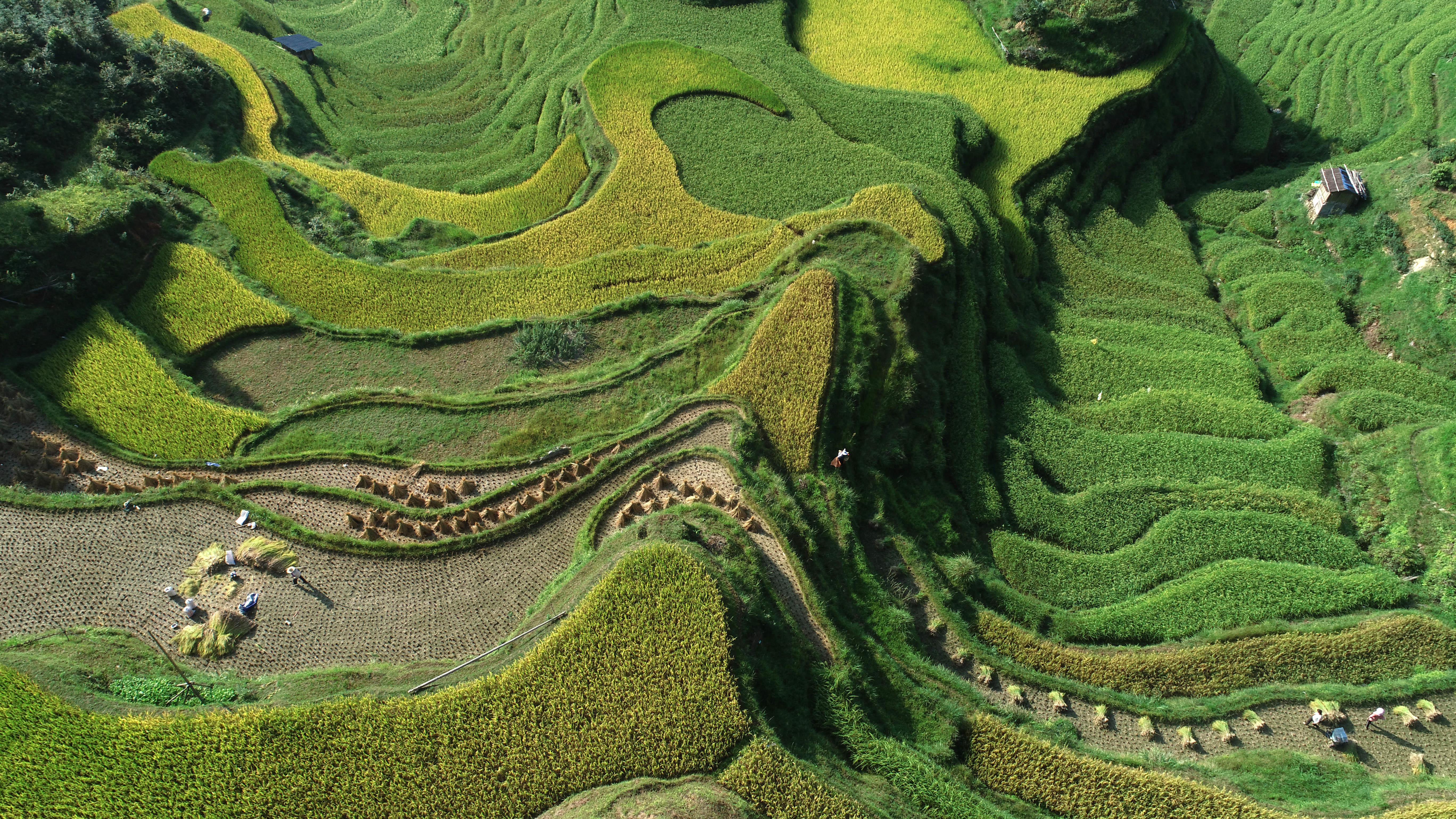 9月11日,在从江县加榜乡加页村,村民在梯田里收获稻谷(无人机照片)。新华社发(吴吉斌 摄)