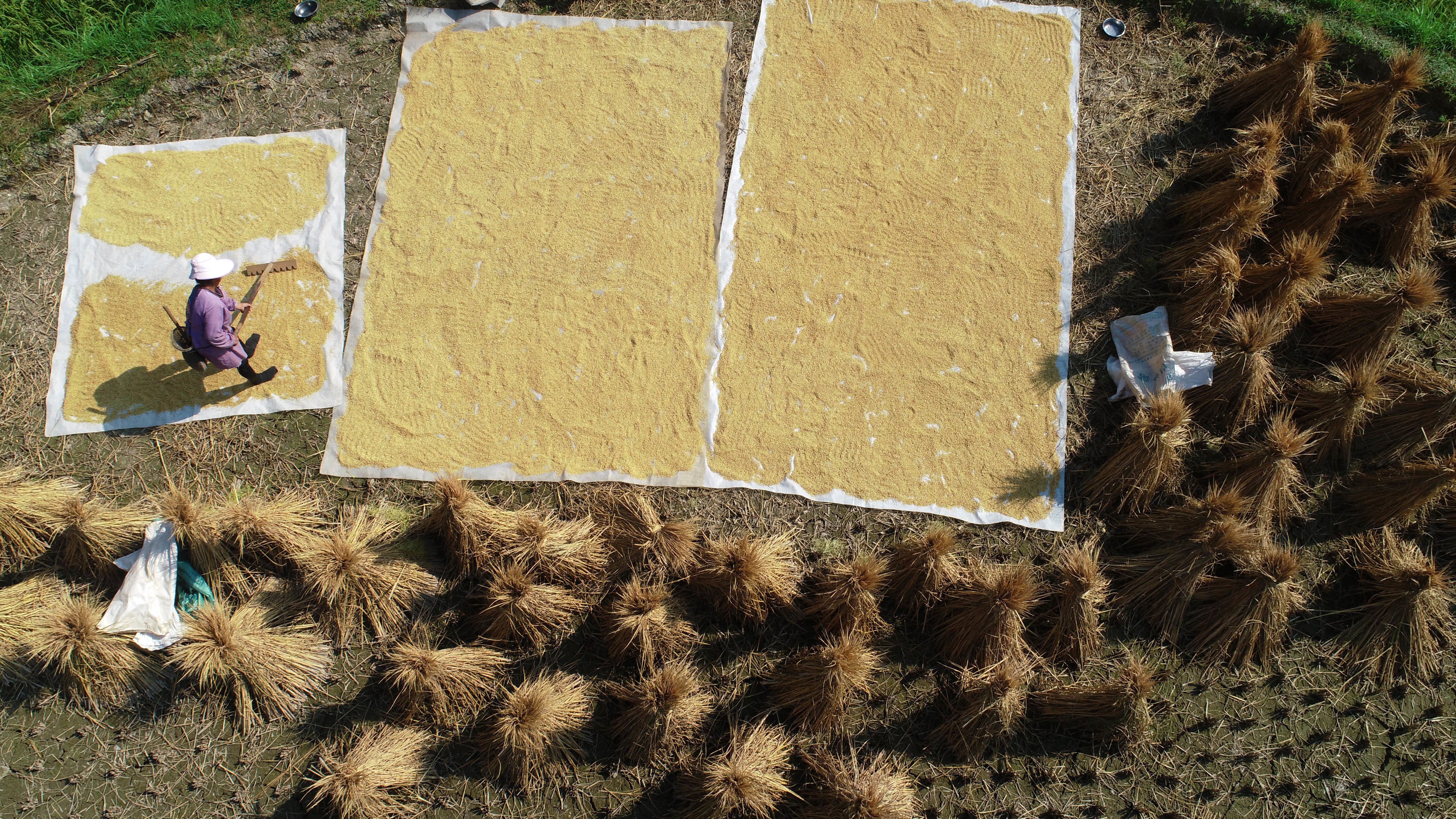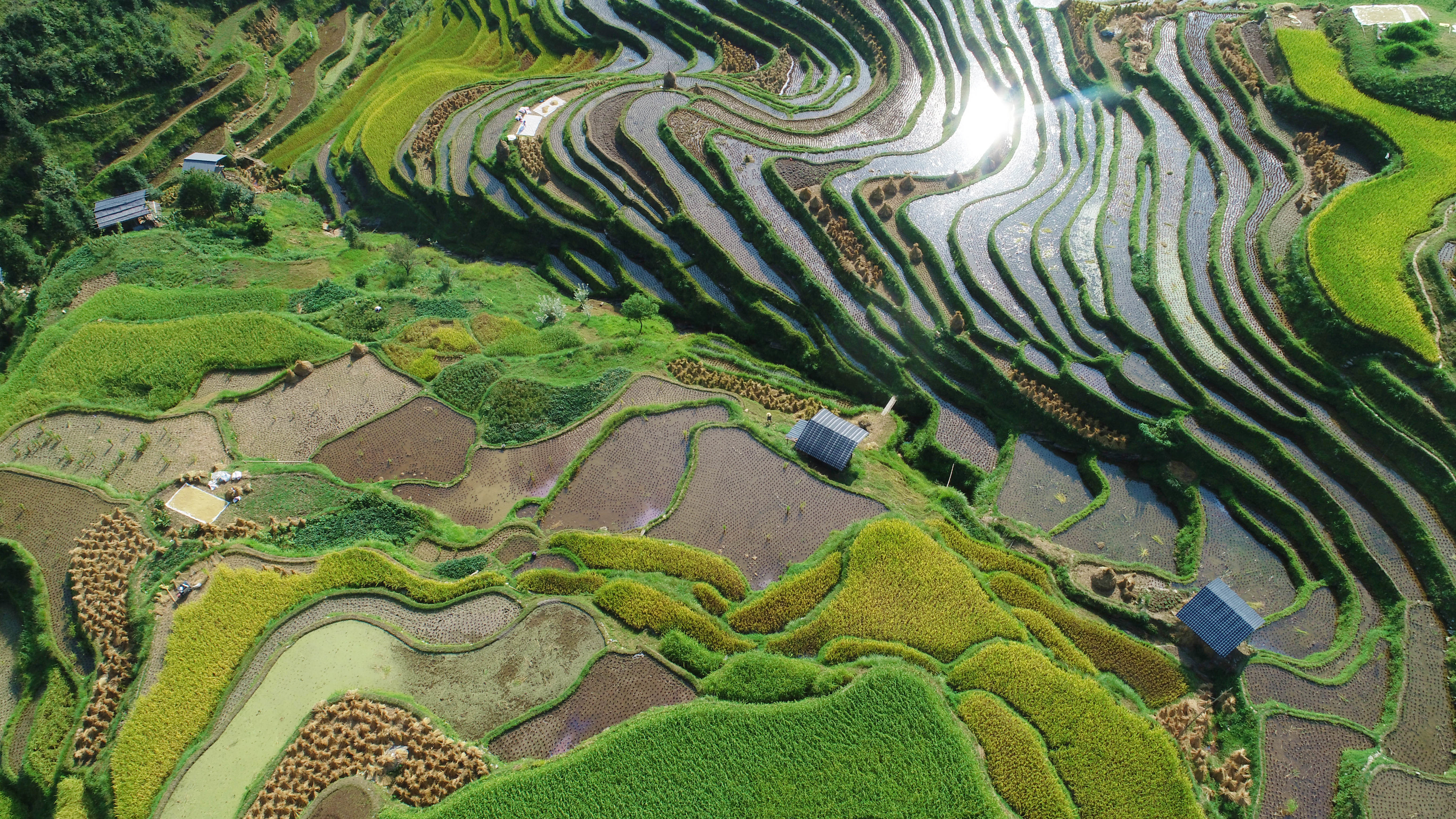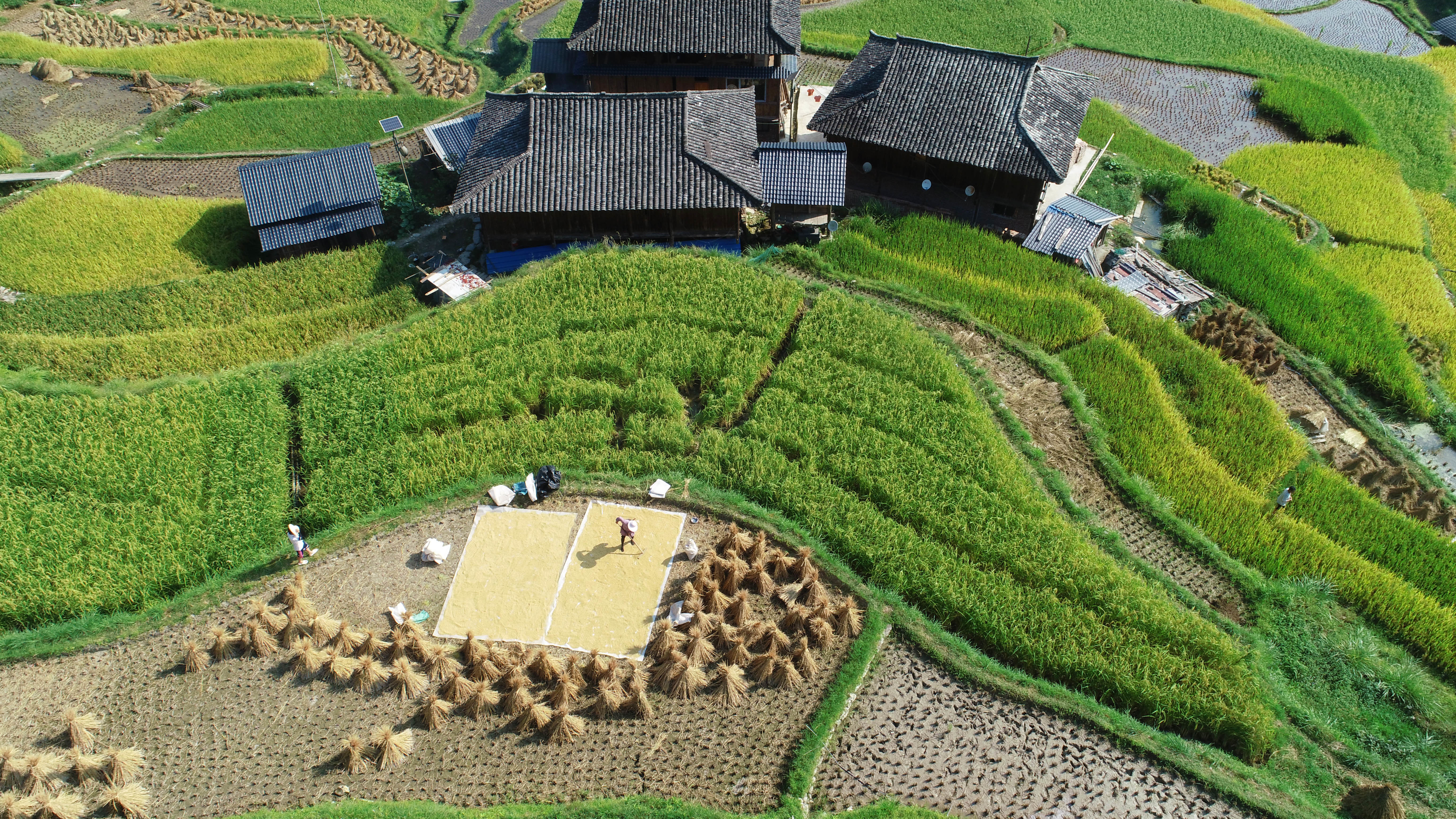 9月11日,在从江县加榜乡加页村,村民在梯田里晾晒稻谷(无人机照片)。新华社发(吴吉斌 摄)