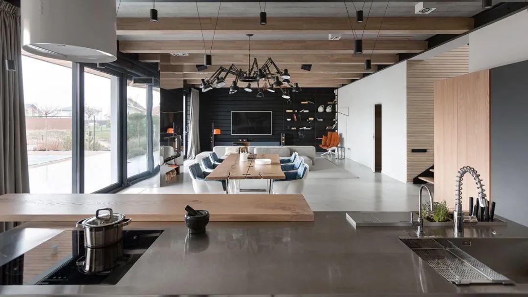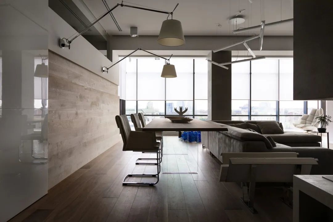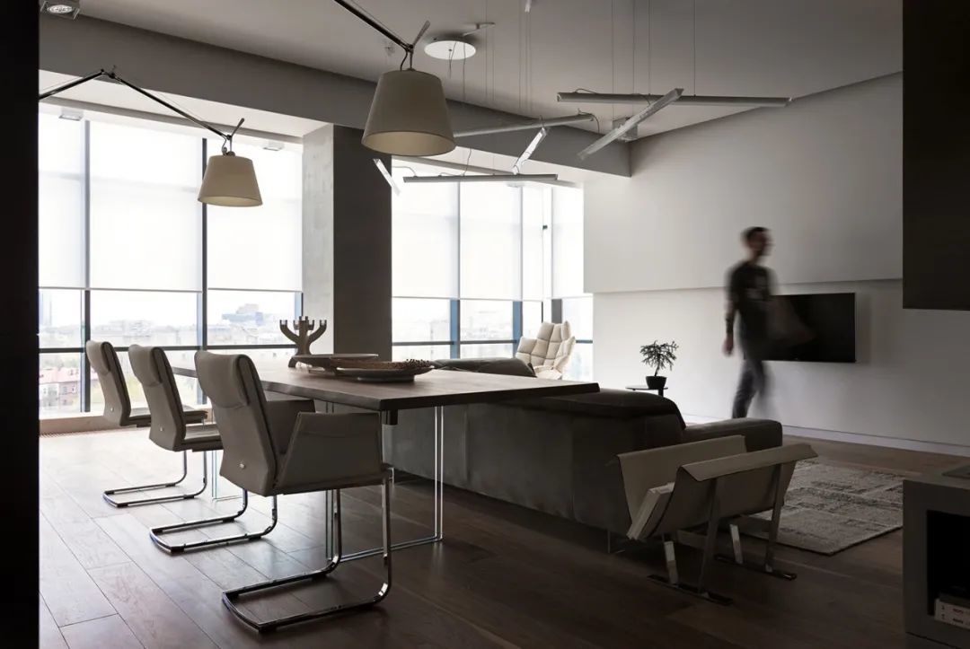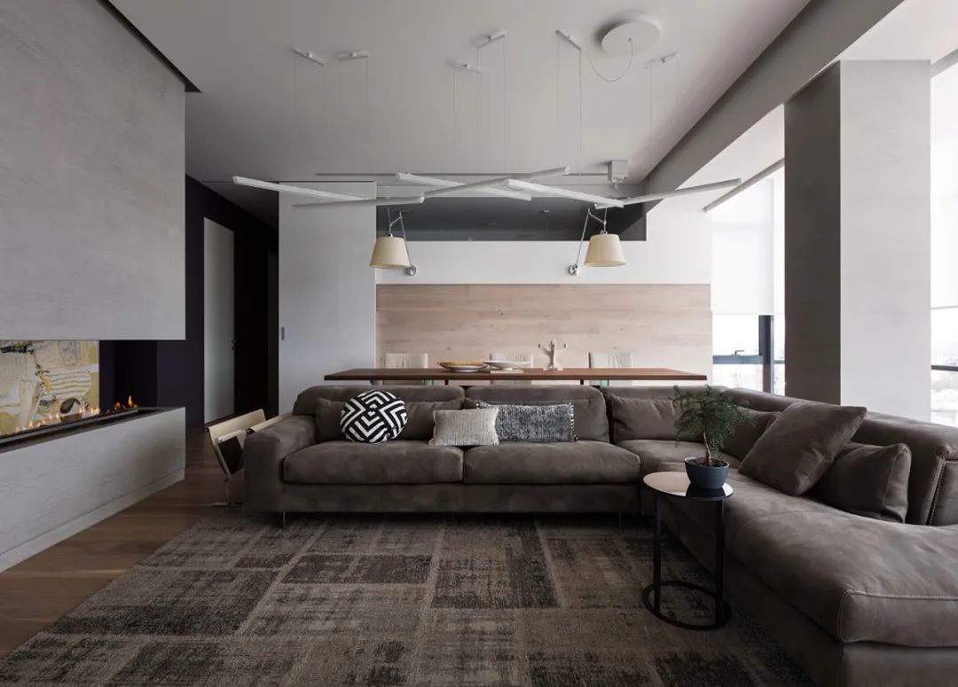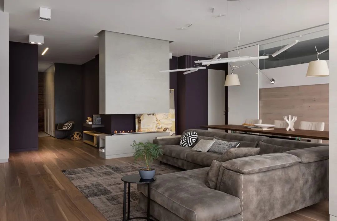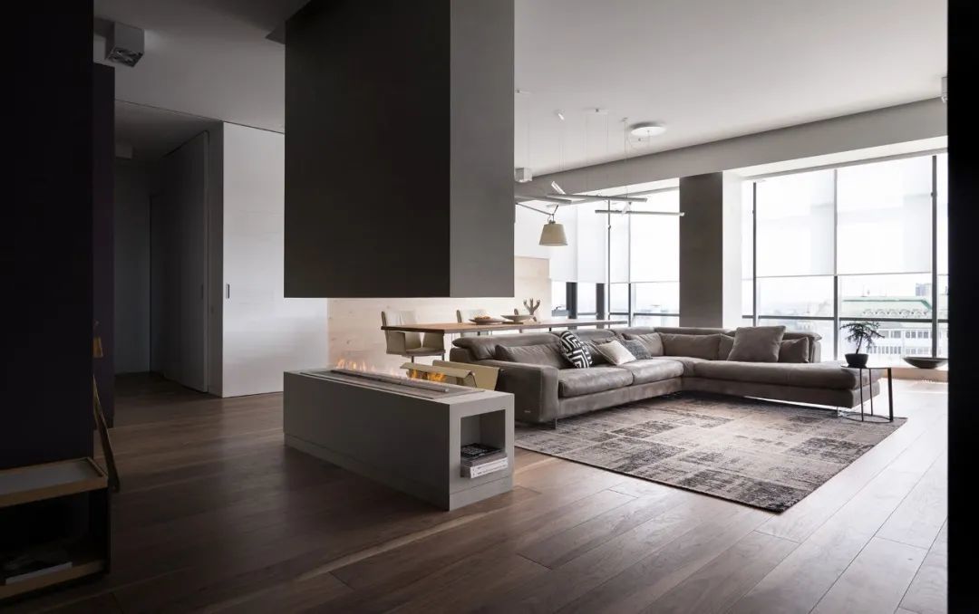 室内的墙壁比较独特,专为该项目设计。起居区的重点是Planika制作的壁炉,它不仅可以发挥其直接功能,还可以将休息区与大厅隔开。沙发的后面是Cattelan Italia制作的餐桌,餐桌配有天然木制桌面和玻璃脚。