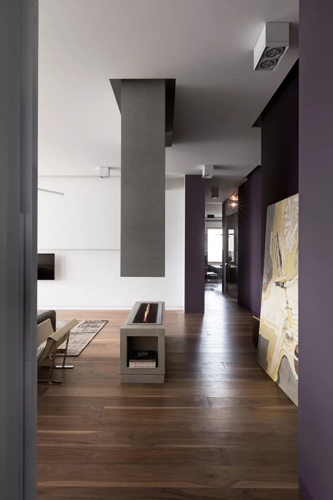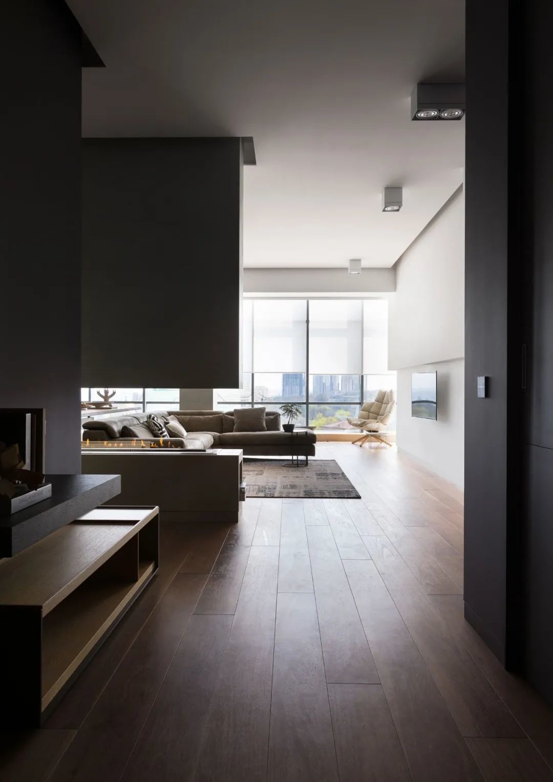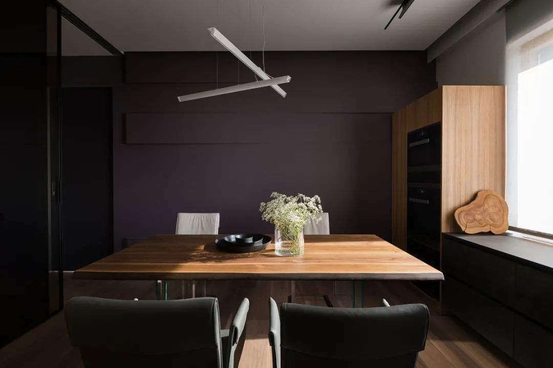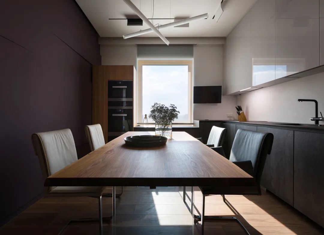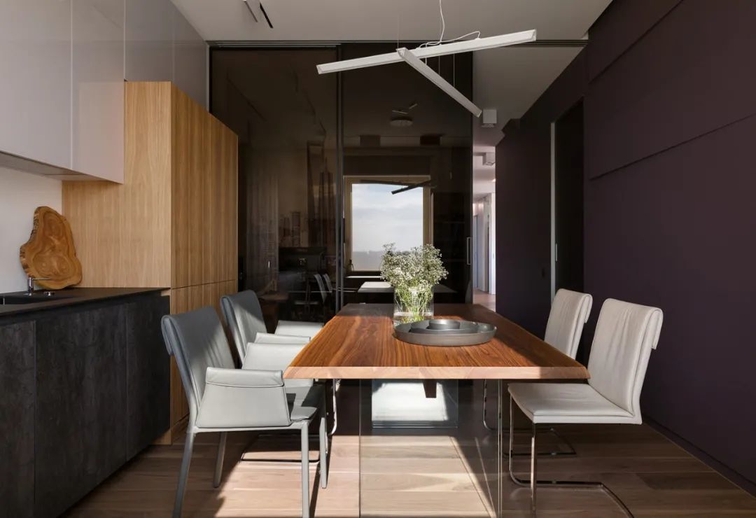 室内的墙壁比较独特,专为该项目设计。起居区的重点是Planika制作的壁炉,它不仅可以发挥其直接功能,还可以将休息区与大厅隔开。沙发的后面是Cattelan Italia制作的餐桌,餐桌配有天然木制桌面和玻璃脚。