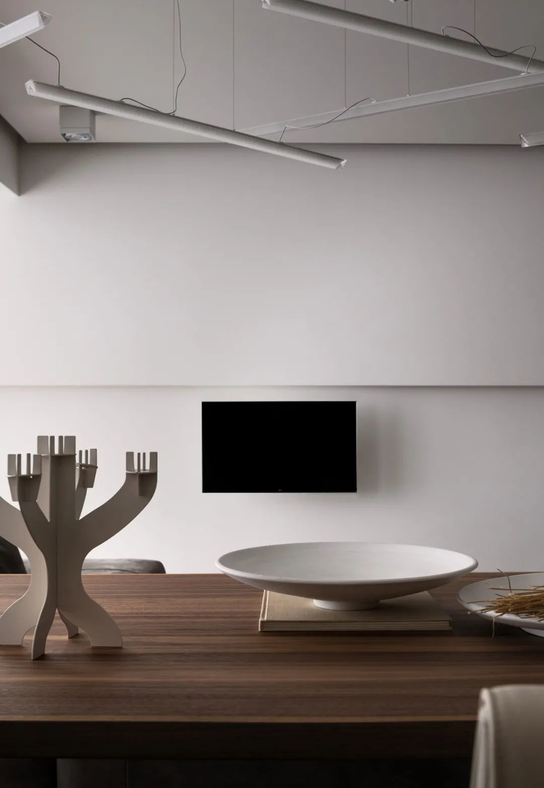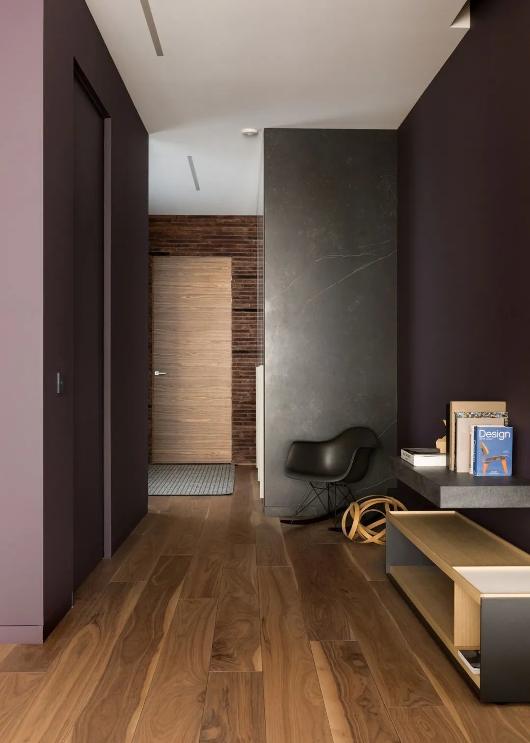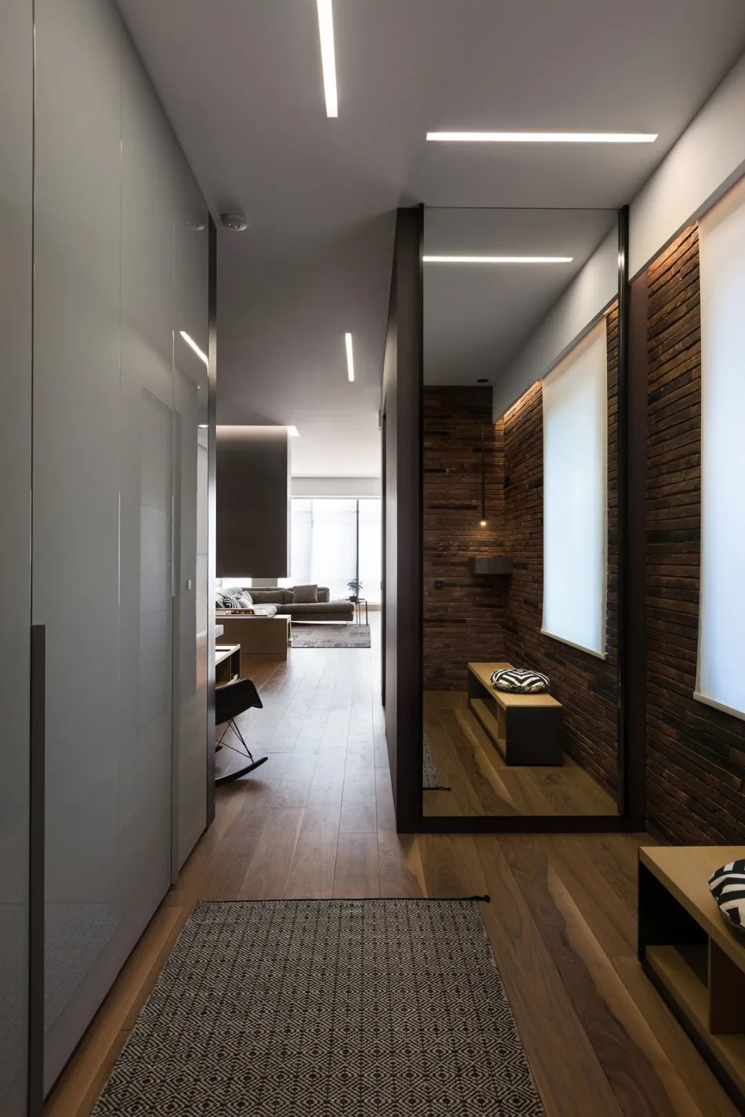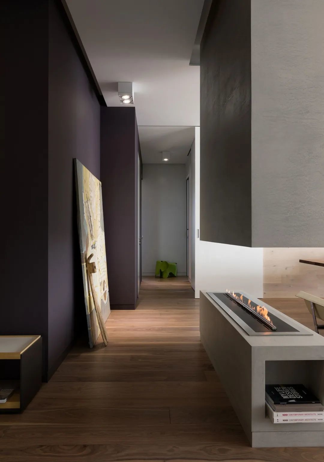 室内的墙壁比较独特,专为该项目设计。起居区的重点是Planika制作的壁炉,它不仅可以发挥其直接功能,还可以将休息区与大厅隔开。沙发的后面是Cattelan Italia制作的餐桌,餐桌配有天然木制桌面和玻璃脚。