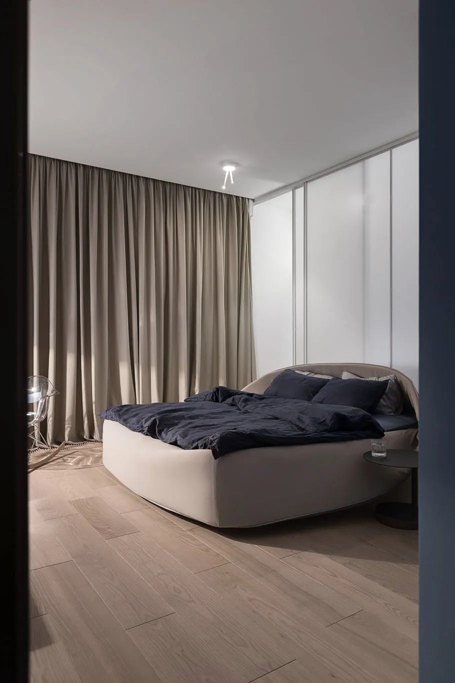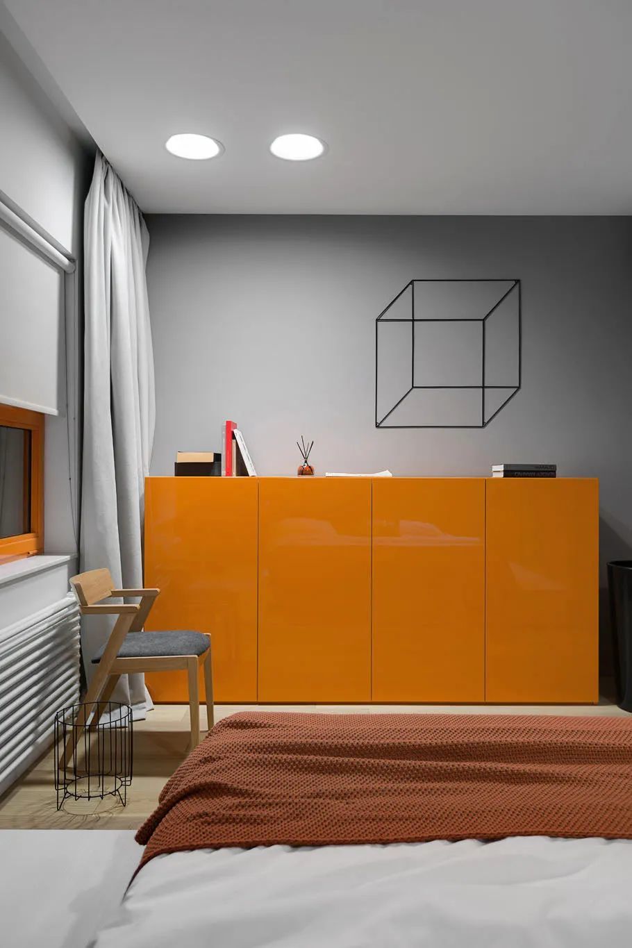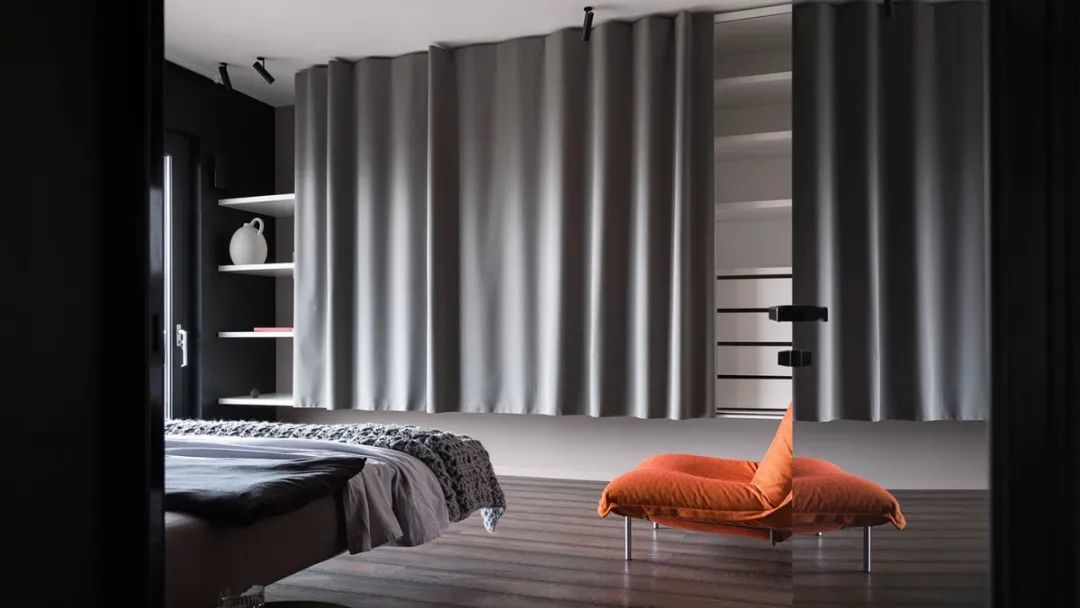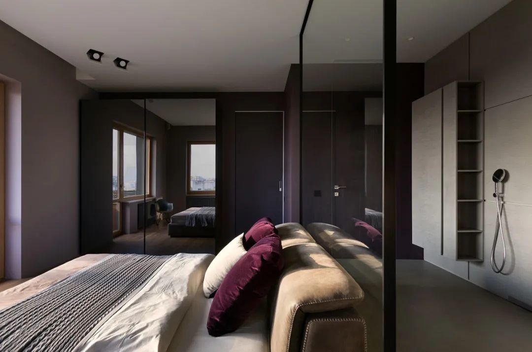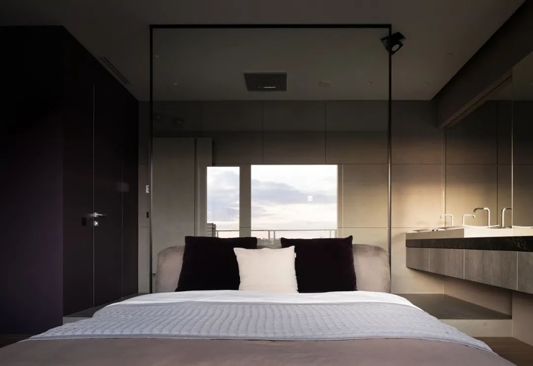 卧室是简约风格的,有一个大的全景窗。它与卧室壁橱毗连,壁橱通向浴室。墙面和地板的表面也是用清水泥板制成的。