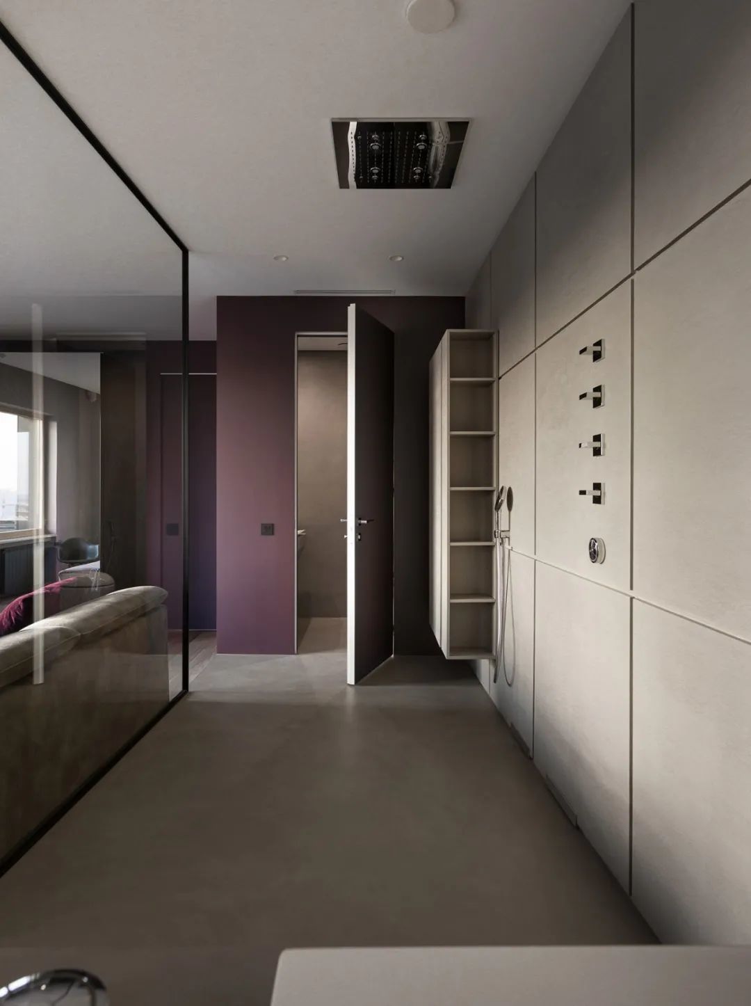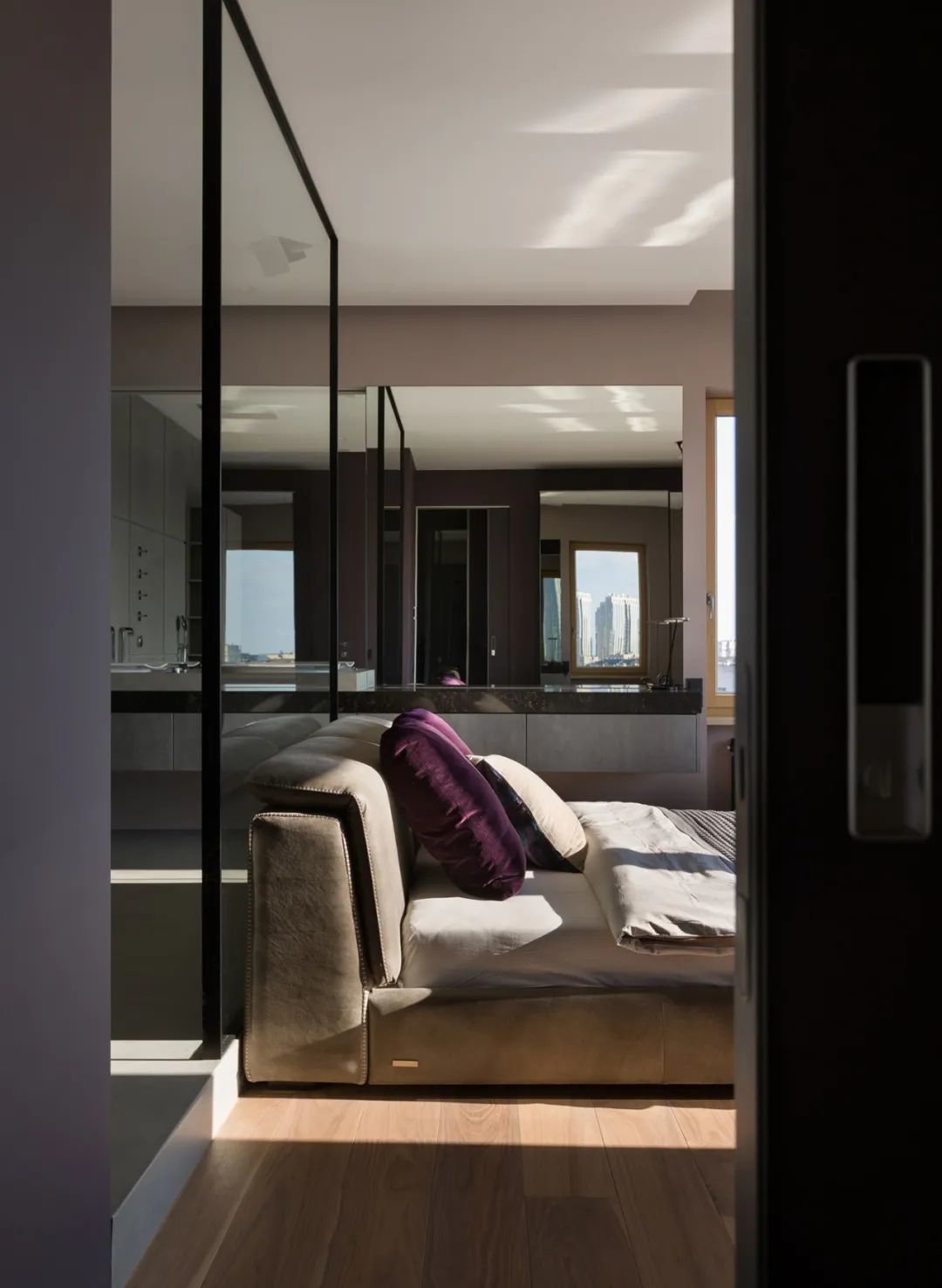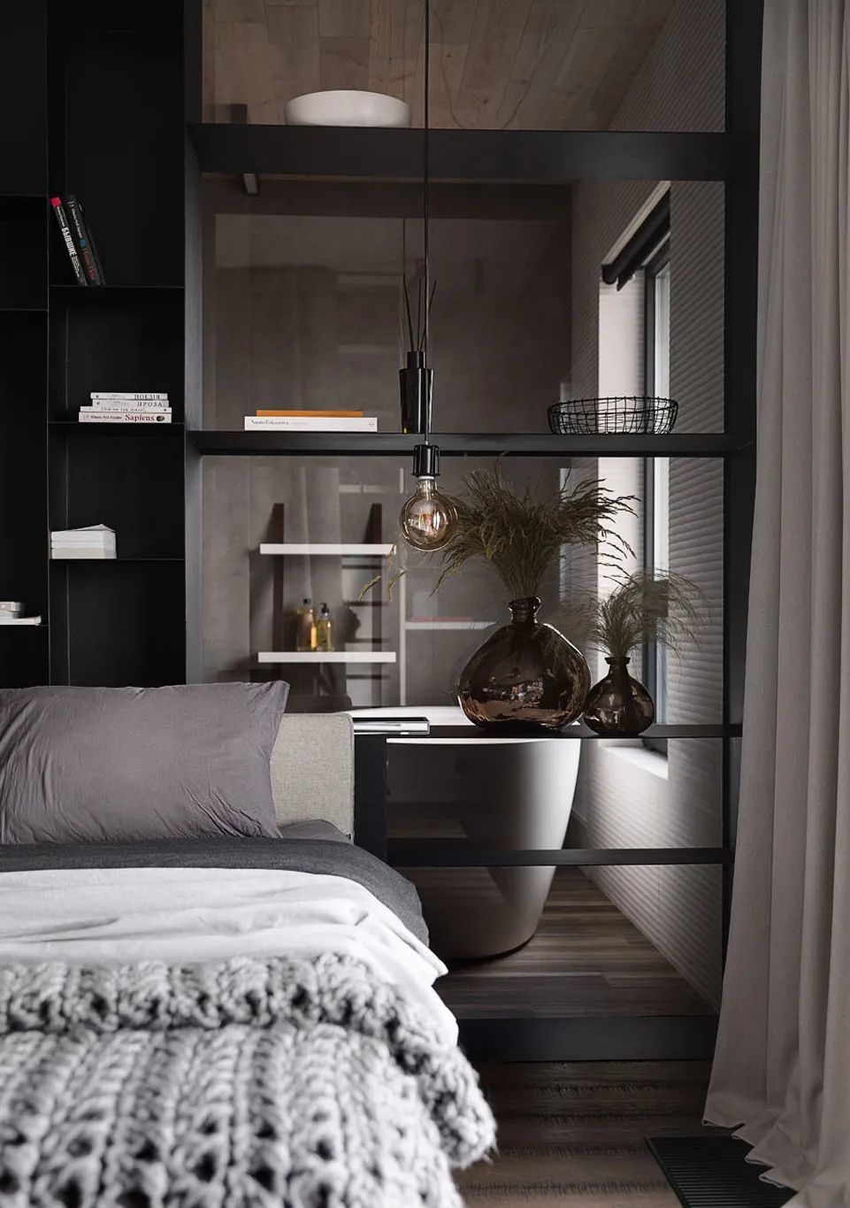 卧室是简约风格的,有一个大的全景窗。它与卧室壁橱毗连,壁橱通向浴室。墙面和地板的表面也是用清水泥板制成的。