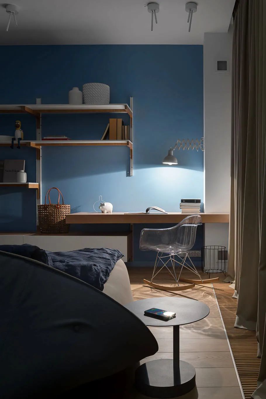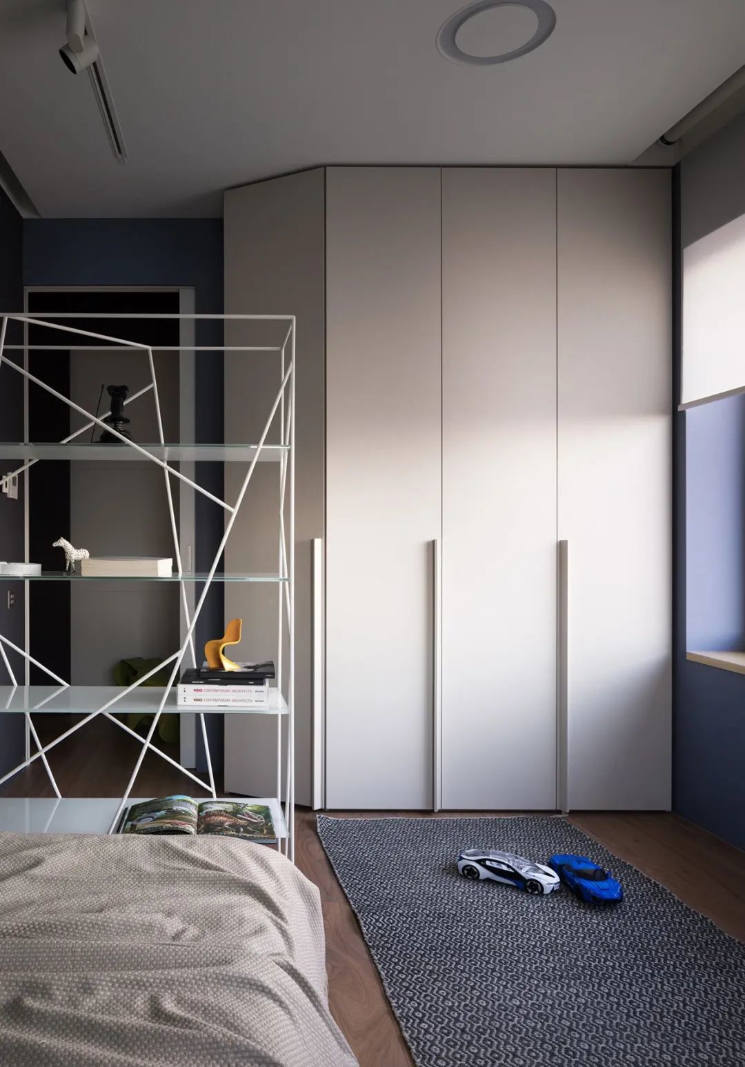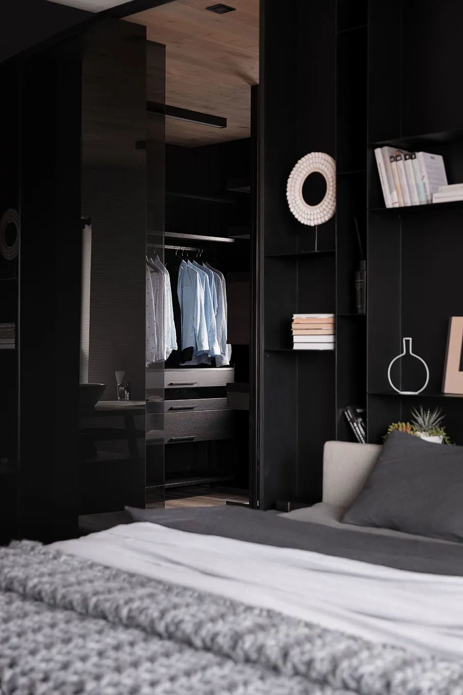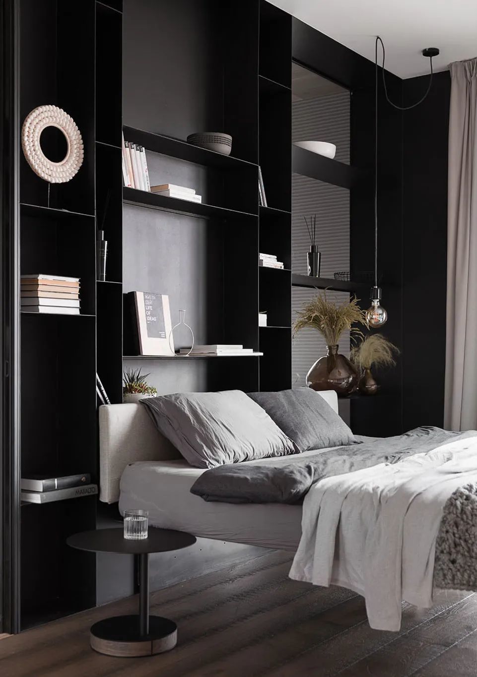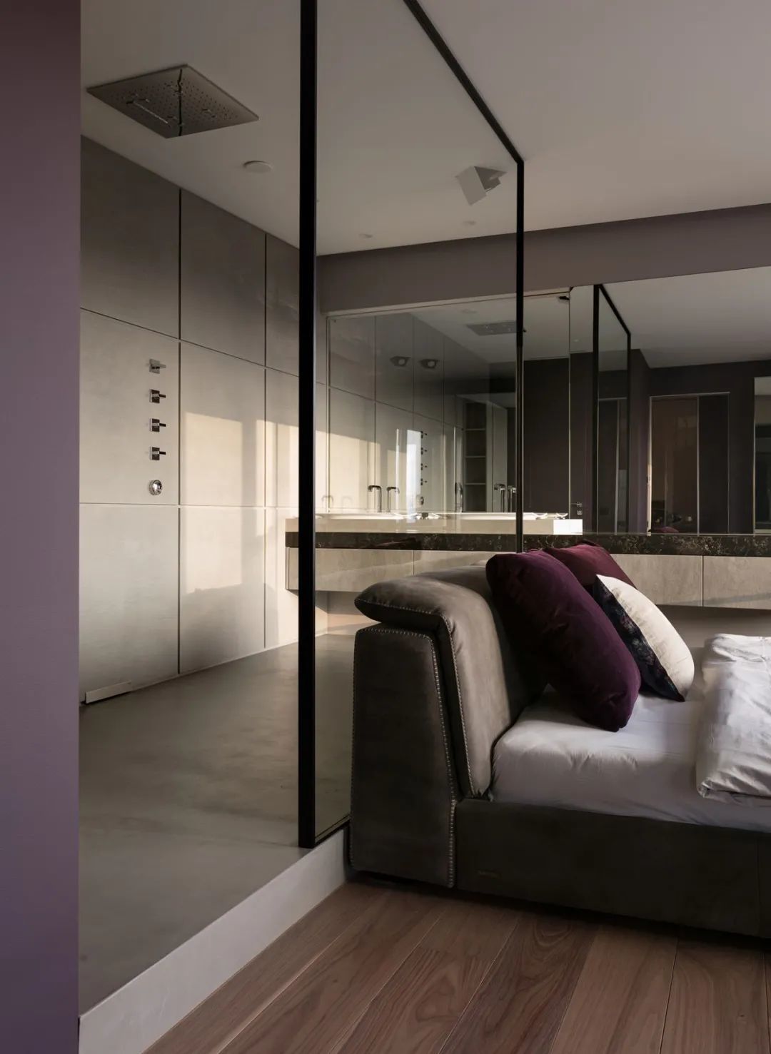 存储系统隐藏在一个半透明的墙后面,该墙位于床头板后面。