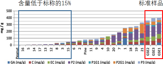 市场产品和标准样品葡萄籽提取物含量对比/来源:参考文献[3]