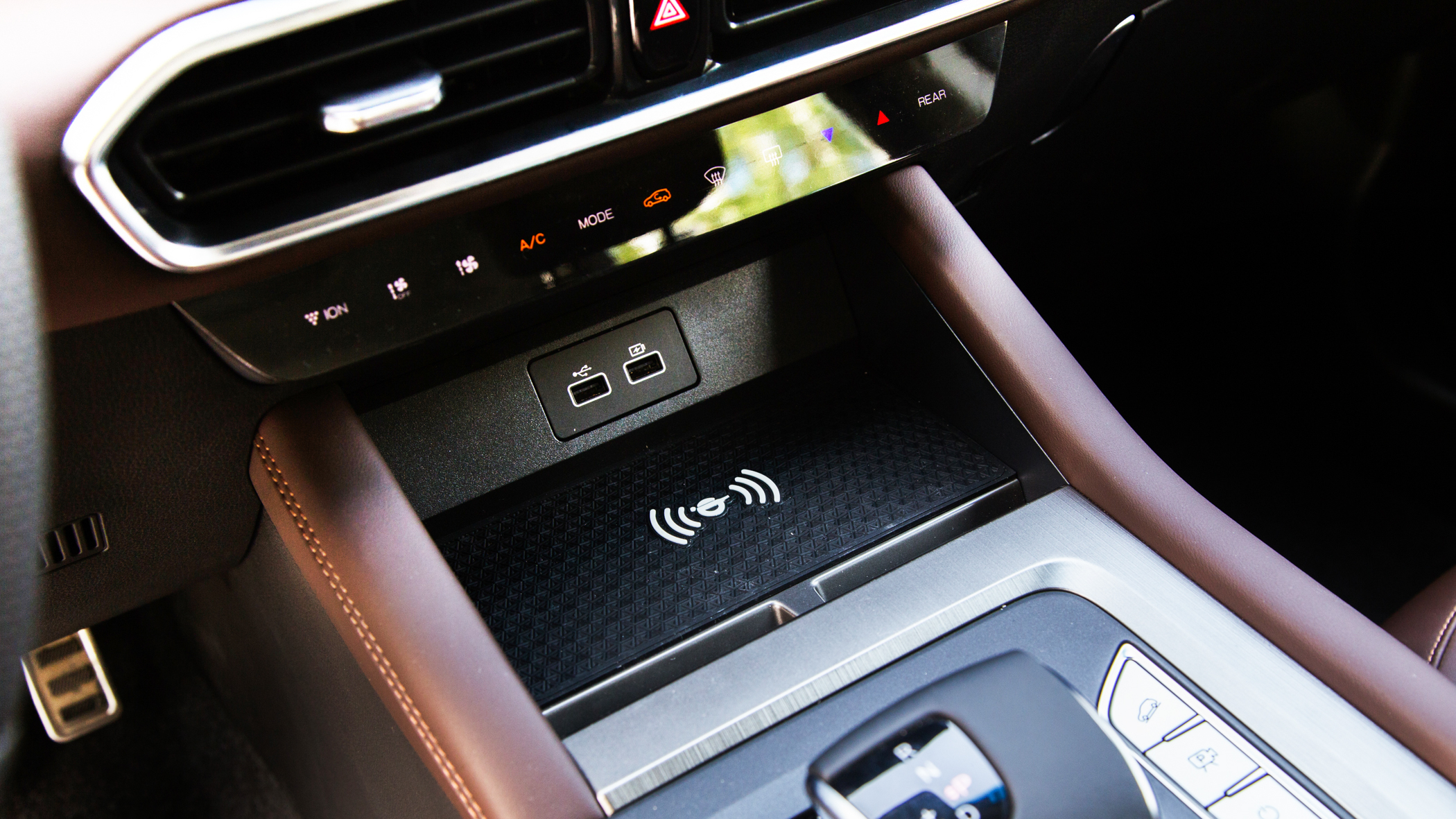 空调出风口下方原先采用了一块大屏作为空调控制,如今改为了一排触摸按键,通过激活中控大屏控制空调界面,为下方所腾出的空间正好可以放置手机无线充电台,实用性得到了进一步的提升。