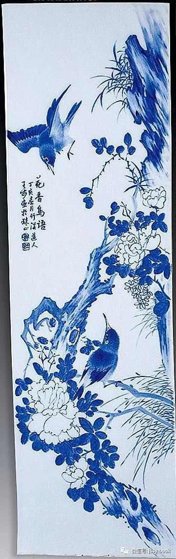 景德镇青花瓷板画是运用天然钴料在白泥上进行绘画装饰,再罩以透明釉,然后在高温1300摄氏度上下一次烧成,使色料充分渗透于坯釉之中,呈现青翠欲滴的蓝色花纹,显得幽倩美观,明净素雅。