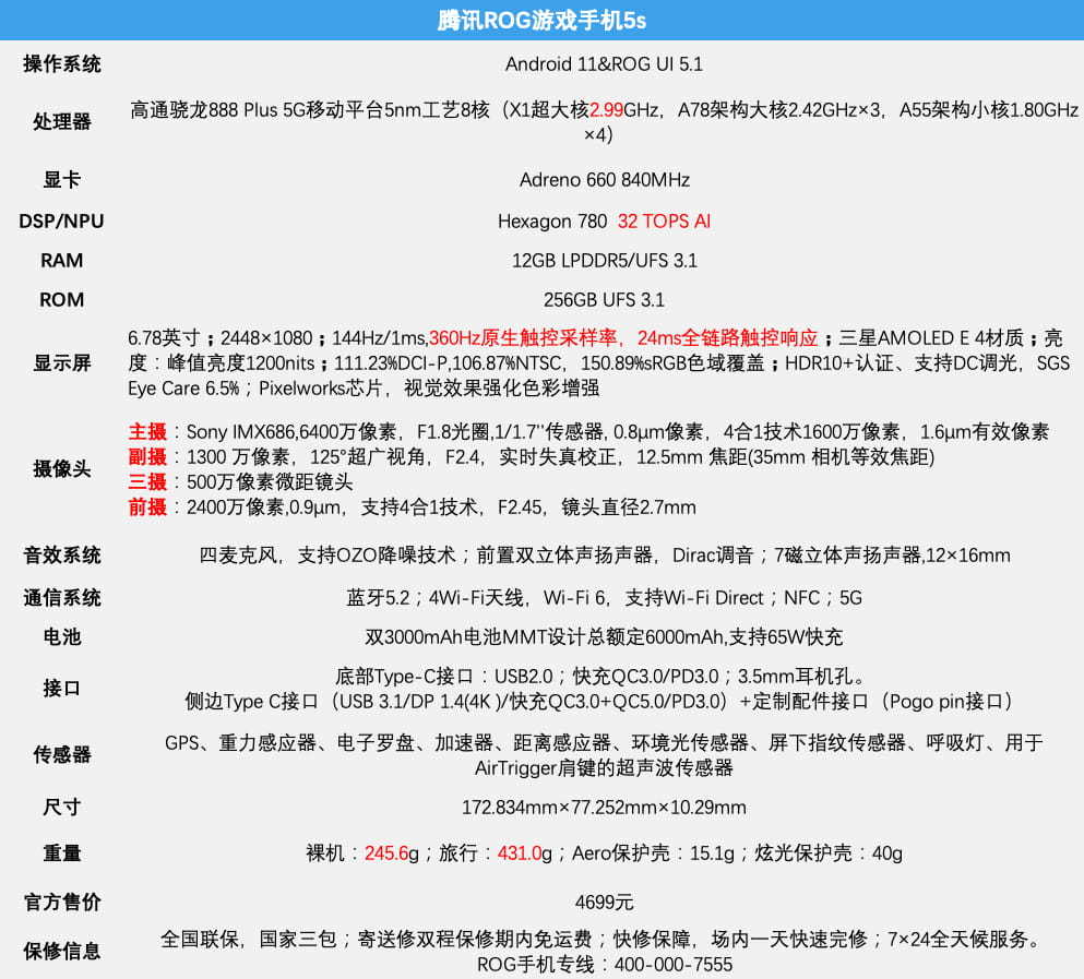 作为年中升级款腾讯ROG游戏手机5s/5s Pro系列搭载了高通最新骁龙888 Plus 5G移动平台,此外ROG还在屏幕和操控方面进行了小幅升级。我们此次拿到的是腾讯ROG游戏手机5s,12GB+256GB版本,下面是详细硬件数据。