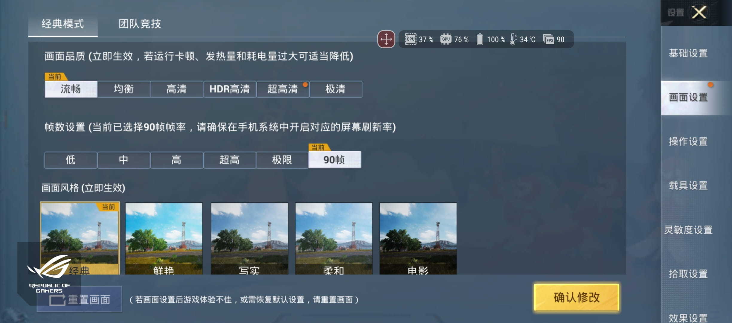 《王者荣耀》设置最高帧率90FPS,游戏画面设置到高清模式。在游戏过程中游戏画面帧率非常稳定,游戏显示帧率一直是90FPS,而手机自带的游戏精灵实时显示帧率信息最低90FPS,偶尔还会超过90帧。