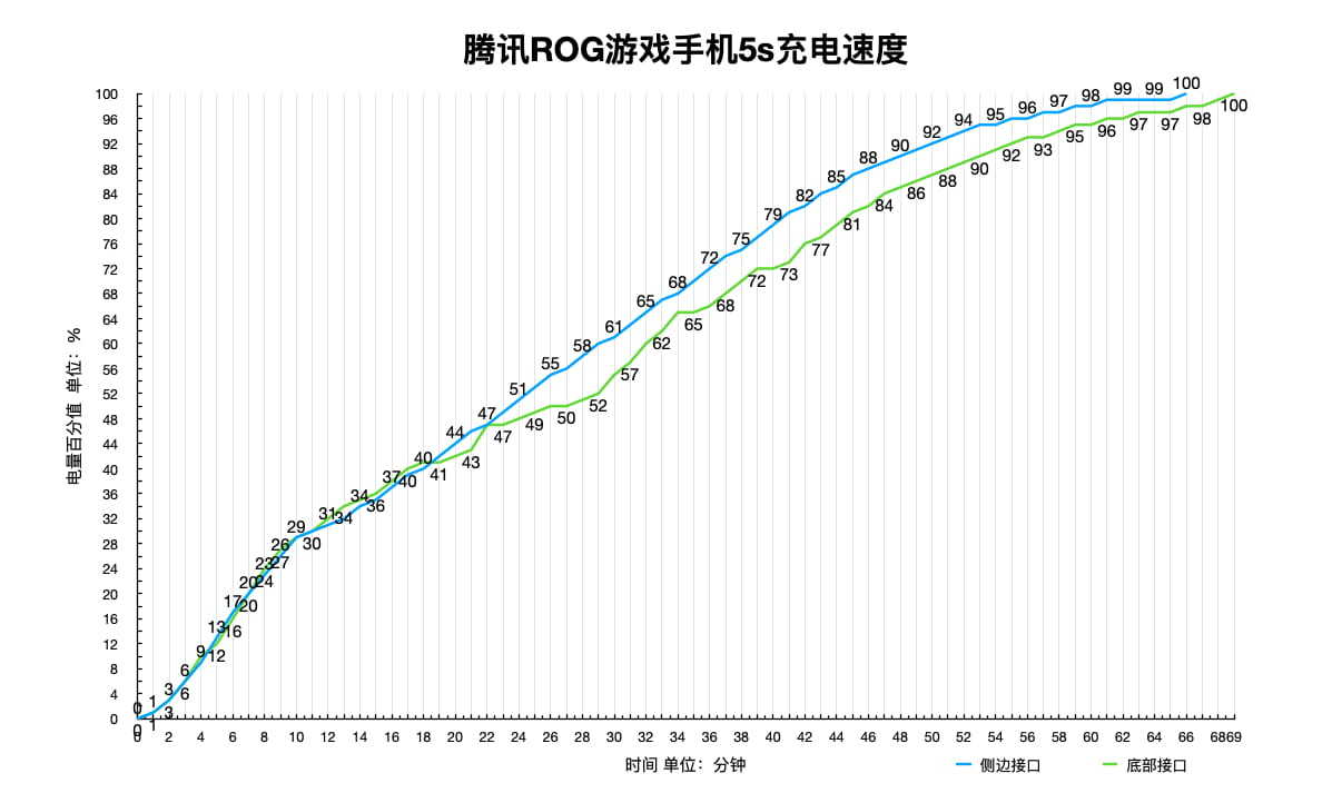 电量耗尽关机后,使用原装充电器+充电线分别对两个接口进行充电测试。从测试结果来看,在最初的30%两个接口充速度相差无几,基本上在9分钟左右完成充电。之后底部接口的充电速度稍微慢一点,但幅度并不是很大,只比侧边接口慢3分钟左右完成充电。