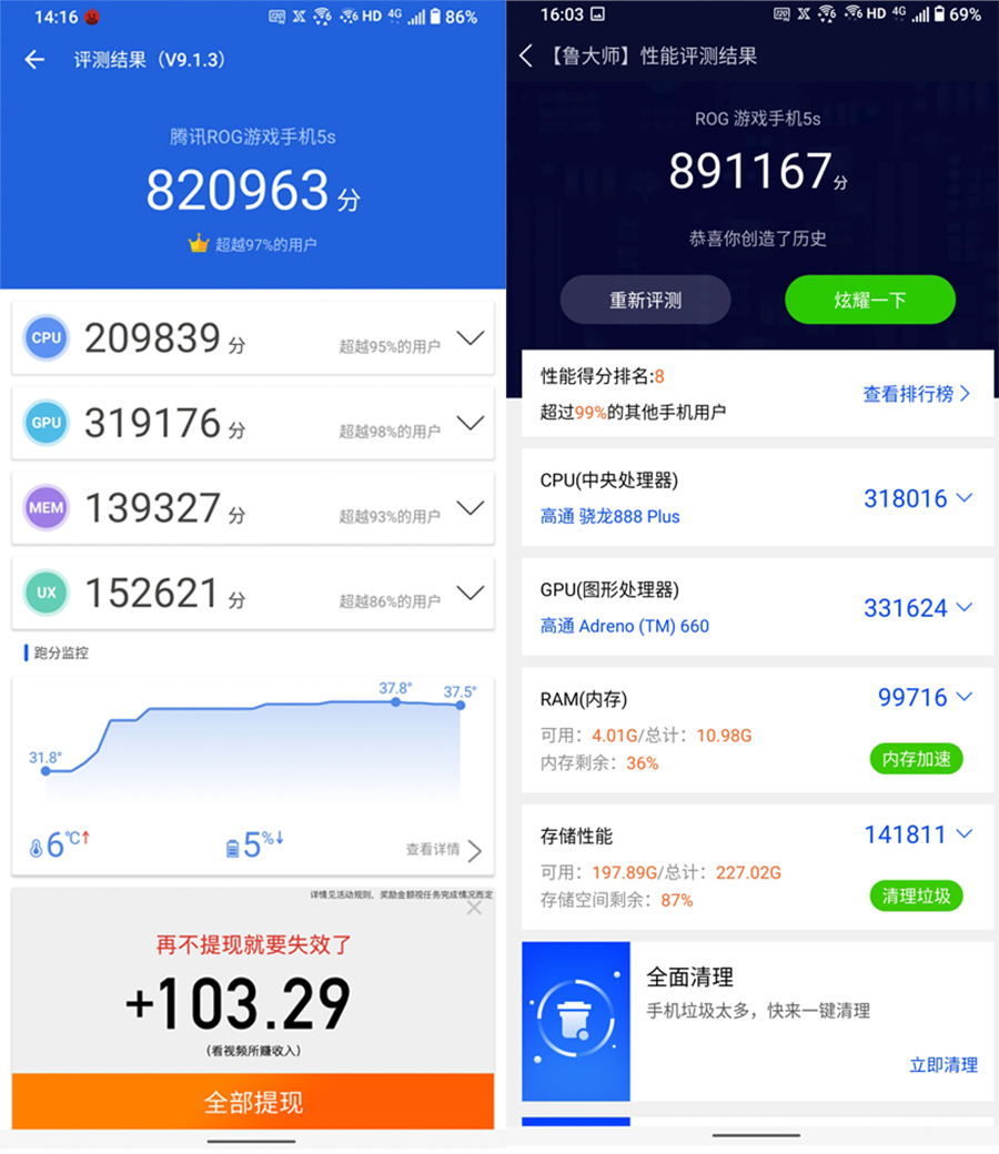 从上面的各项测试成绩不难看出,处理器相关的CPU和GPU的成绩非常高,绝对的顶级水准。之所以总分没有达到腾讯ROG游戏手机5s/5s Pro系列的极致主要是因为RAM(内存)和ROM(存储空间)配置比顶配版要低一些。