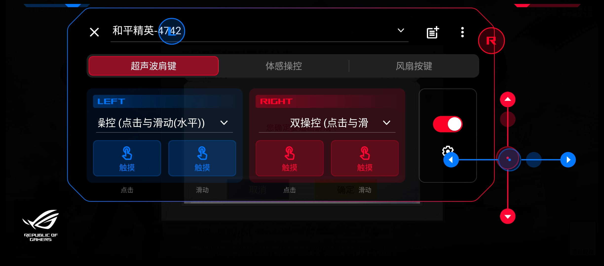 单侧肩键支持同时左右速滑和点击,对应3个映射按键。在肩键上点击+左右滑动可以映射为游戏中的一个点和左右/上下查看视野。举个栗子,在《和平精英》游戏中将右侧肩键设置成左右查看视野,这样在游戏中调整跑动方向的同时还可以观看周围环境,第一时间发现隐藏在你周围的敌人。