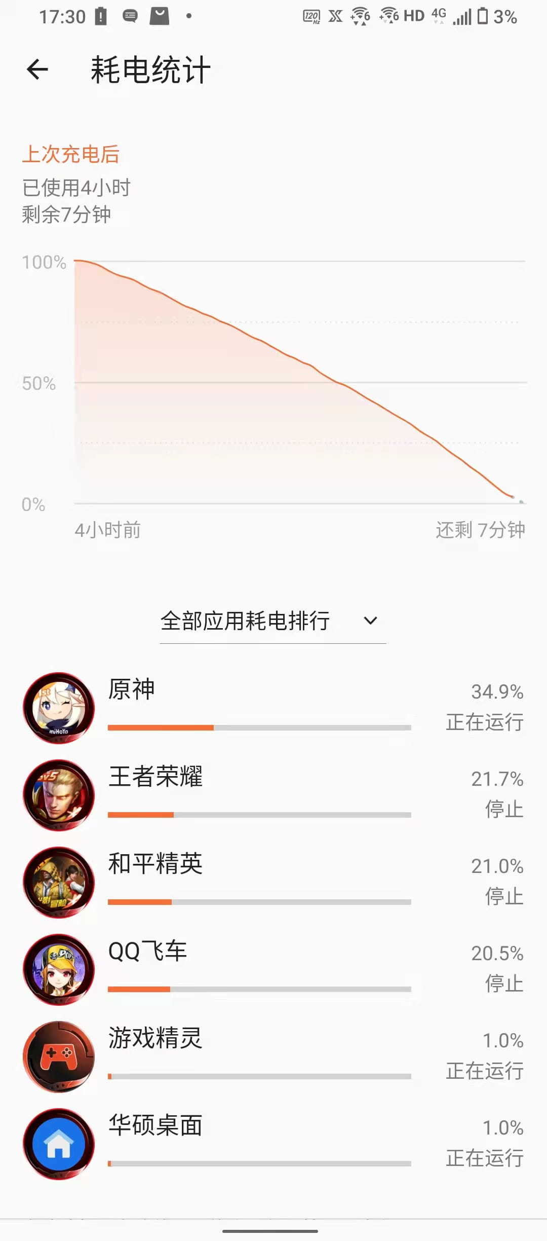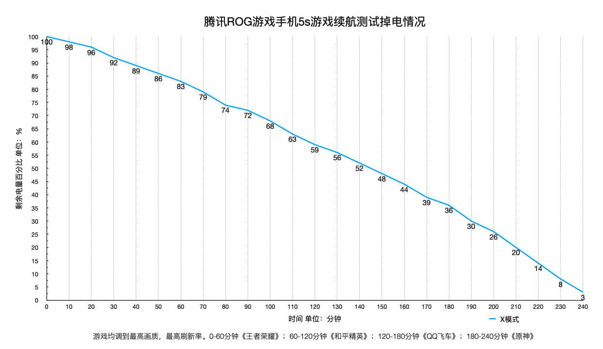 从测试成绩来看,全程释放最高性能的情况下腾讯ROG游戏手机5s可以实现长达4小时的续航时间。其中前三款游戏的耗电情况接近,平均1小时游戏耗电20%多一点。《原神》就比较耗电了,1个小时就消耗掉了近35%。