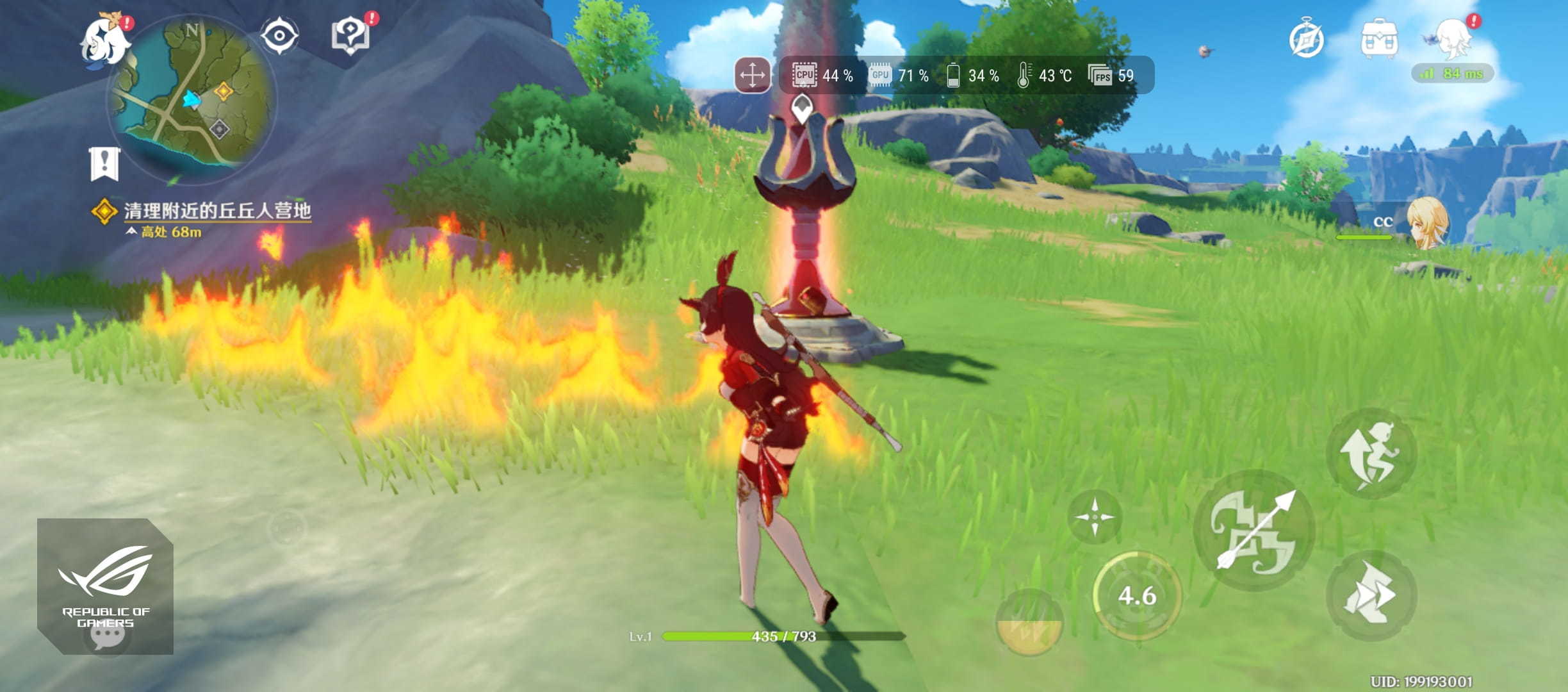 《原神》相比于以上两款游戏来说真的很吃硬件,在开启最大帧率情况下,游戏帧率基本稳定在59帧,虽然没有做到一直满帧运行,但从实际体验来讲游戏画面非常流畅。在运行游戏过程中手机温度也比其他游戏高,通过系统实时信息发现游戏过程中的CPU和GPU的占用非常高。这一切都说明《原神》太吃硬件了,平时玩的话切换到30帧就好。