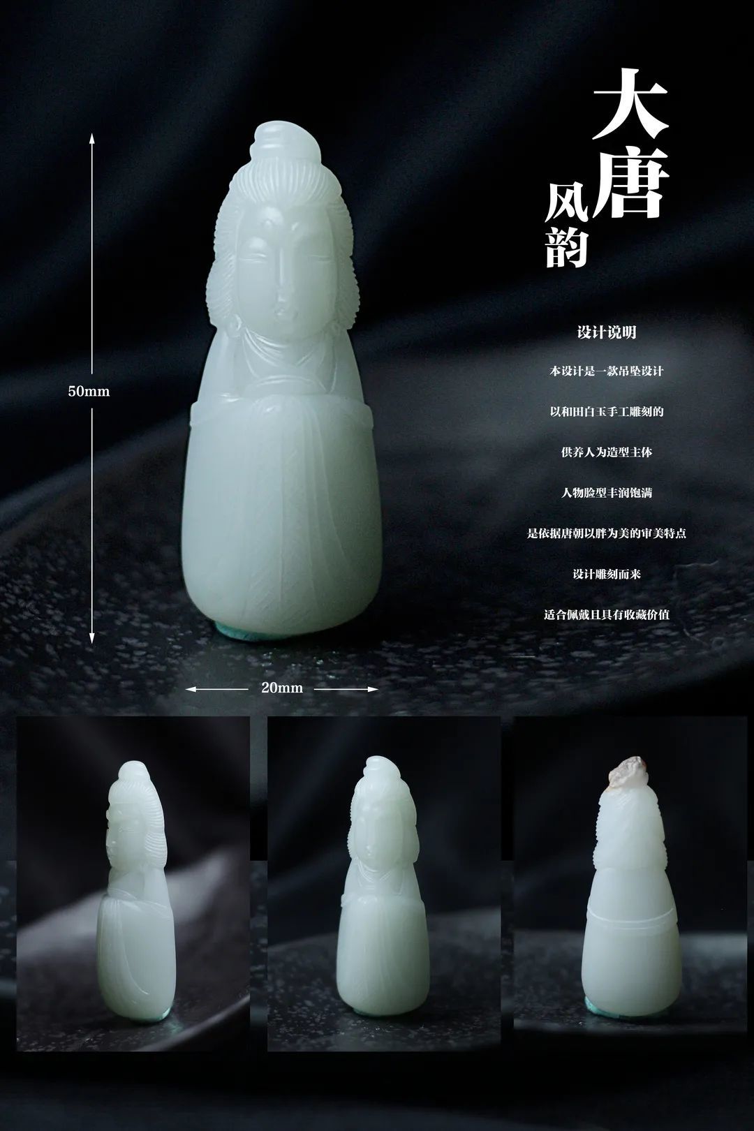 本设计是一款吊坠设计,以和田白玉手工雕刻的供养人为造型主体,人物脸型丰润饱满,是依据唐朝以胖为美的审美特点设计雕刻而来,适合佩戴且具有收藏价值。