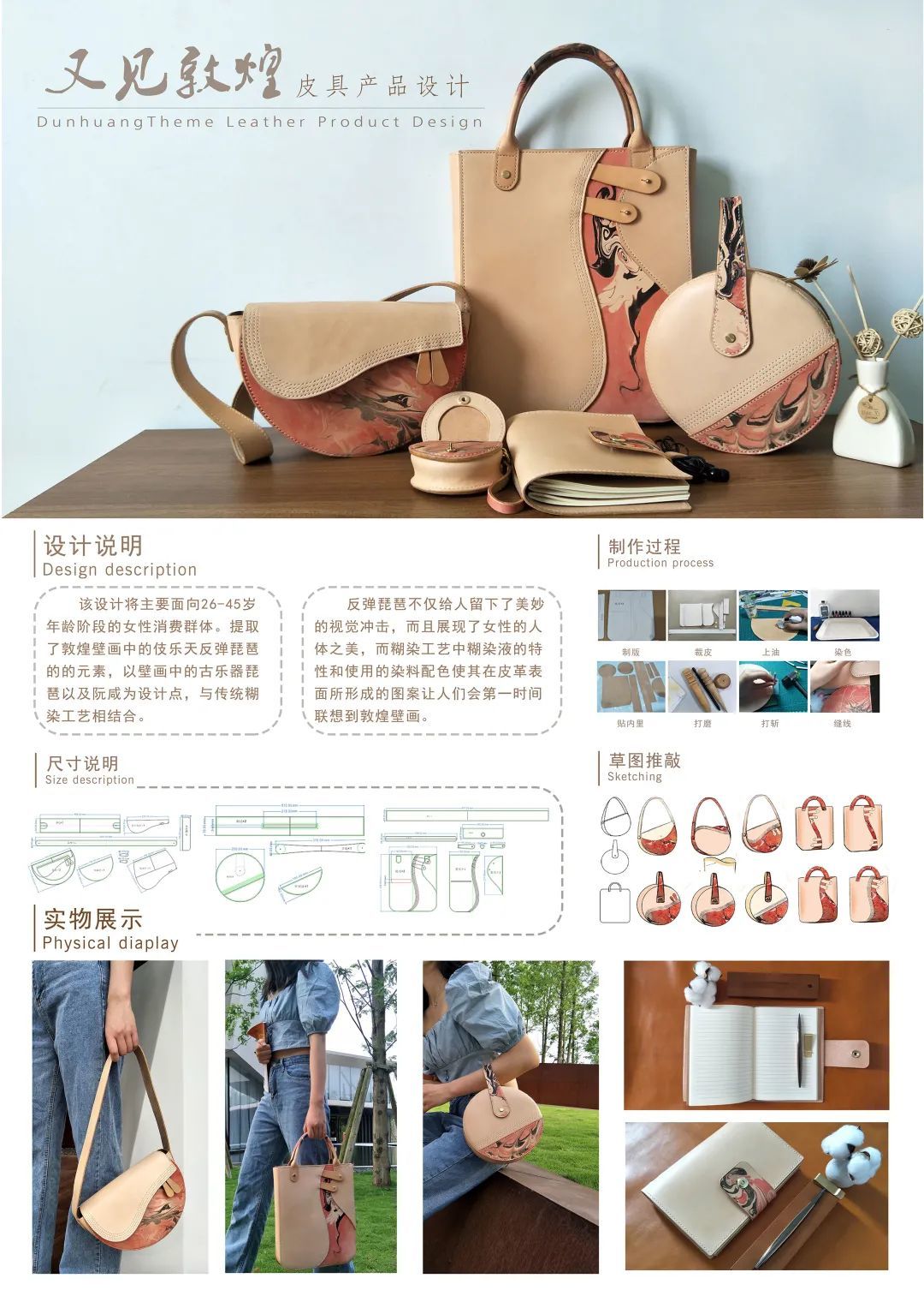该设计将主要面向26-45岁年龄阶段的女性消费群体。提取了敦煌壁画中的伎乐天反弹琵琶的元素,以壁画中的古乐器琵琶以及阮咸为设计点,与传统糊染工艺相结合。提取了琵琶和阮咸的外部轮廓特征,运用柔美的曲线以及外形将其外部轮廓进行抽象表达,运用走线的方式表达乐器的弦,运用糊染工艺的色彩展现敦煌元素,并且使用拼接的方式将琵琶元素与糊染工艺相融合。反弹琵琶不仅给人留下了美妙的视觉冲击,而且展现了女性的人体之美,而糊染工艺中糊染液的特性和使用的染料配色使其在皮革表面所形成的图案让人们会第一时间联想到敦煌壁画 。