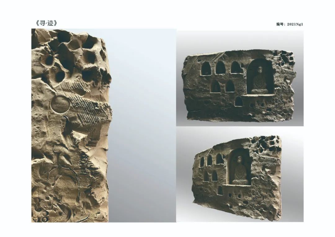 《寻·迹》依据敦煌莫高窟为原型,采用原矿粗陶和黄陶泥1:1混合后为原料进行创作,作品运用抽象的手法进行肌理创作,使作品表面体现出敦煌石窟经过历史岁月留下的侵蚀风化破碎的表面肌理。作品主题为一座石窟,石窟中有一座禅床式低坛,上塑一位高僧的坐相。左侧伴有风化过度的佛像相互辉映。体现出大自然和古代能工巧匠工匠共同努力的景象。