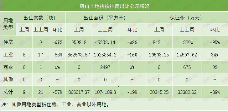 上周(2021年9月6日-2021年9月12日)土地招拍挂出让共计9宗,其中1宗城镇住宅用地出自玉田。8宗工业用地,分别出自曹妃甸、玉田、汉沽。