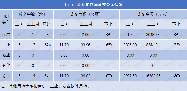 截至9月13日9时编辑截稿,编辑监测中国土地网土地数据,上周(2021年9月6日-2021年9月12日)唐山土地成交5宗地,共计11.79公顷,成交金额约为2297.59万元。连续两周1宗成交的住宅用地市场,在上周再次回到零成交,自8月以来,住宅用地成交情况一直低迷,最好水平仅仅为成交1宗,相反的工业用地始终保持成交主角的地位。