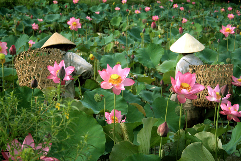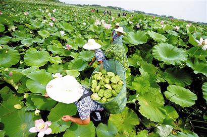 在江南,既有以在土地上种稻田、麦田、菜田为生的农民,也有像洞庭湖、太湖等湖区以鱼田养鱼、荷田植菱植莲为生的“种水”农民。所以,荷田与稻田在这里是同一个意思。只不过是,稻田里所产的是稻谷,荷塘里所产的是莲子。从这个层面上来说,“莲叶何田田”的田,也是农田的意思。这样一来,田田二字不仅有外形上的比喻,更是有内涵上的神似!