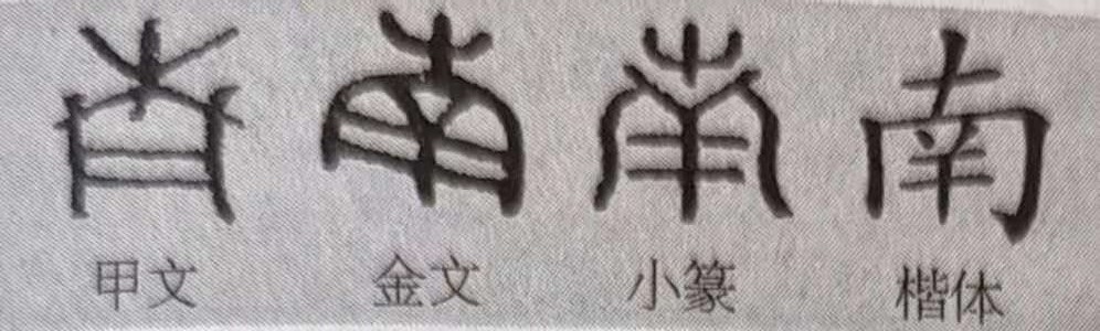 “南nán”的原型为一种金属制的乐器,即包括青铜编钟在内的铃、铎、钲等。上古时期,这类乐器曾流行于盛产青铜的长江铜腰带地区的部落,后传入中原,成为当时殷商民族的乐器之一。“南”和鼓、磬均为敲击型乐器,磬是实心的,鼓以皮革包裹,唯有“南”是空心的,并用金属制作,可以任意敲之而不破败。《诗·小雅·鼓钟》:“以雅以南”,毛传注曰:“南夷之乐曰南。”乃是说“南蛮”的这种乐器便称做“南”。从甲骨文到金文、小篆,以及楷书的“南”字,在构形上一脉相承,演化的脉络清晰可辨。