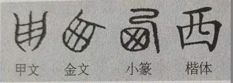 一些文字学家在对甲骨文形体对比后认为:甲骨文中的“西”字,应为汲水陶缶的象形,就是打水用的陶罐。日落西山,在外采集、狩猎、农耕的人们回到居处,汲水做饭成为一天中最后的大事。因此,源自陶缶形象的“西”被假借为日落之方。泛指物品的“东西”一词,即来自由实物取象的袋子和陶罐,这种称谓一直延续至今。