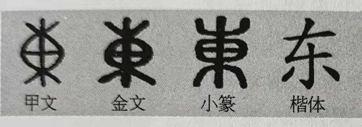 “东dōng”,这是一个指事字。甲骨文和金文中的“东”字,原本特指一种古人常用的袋子。上古时期,人们在搬运东西时,先是在地上铺一块兽皮,中间放一根木棍,东西放到兽皮上后,把兽皮围绕木棍卷起来,两端用皮条或藤条绑扎住,便成为有相当容量的袋子,可以很方便地扛在肩上,宿营在外时,这块兽皮便是实用的床垫。甲骨文中的“束”和“东”便源自这种袋子的象形白描。在“束”的中间增添表示内中盛物的一横,便创设出指事字“東”。《埠仓》注曰:“无底曰橐(tuo),有底曰囊(nang)。”,“东”就是称作橐的无底袋。