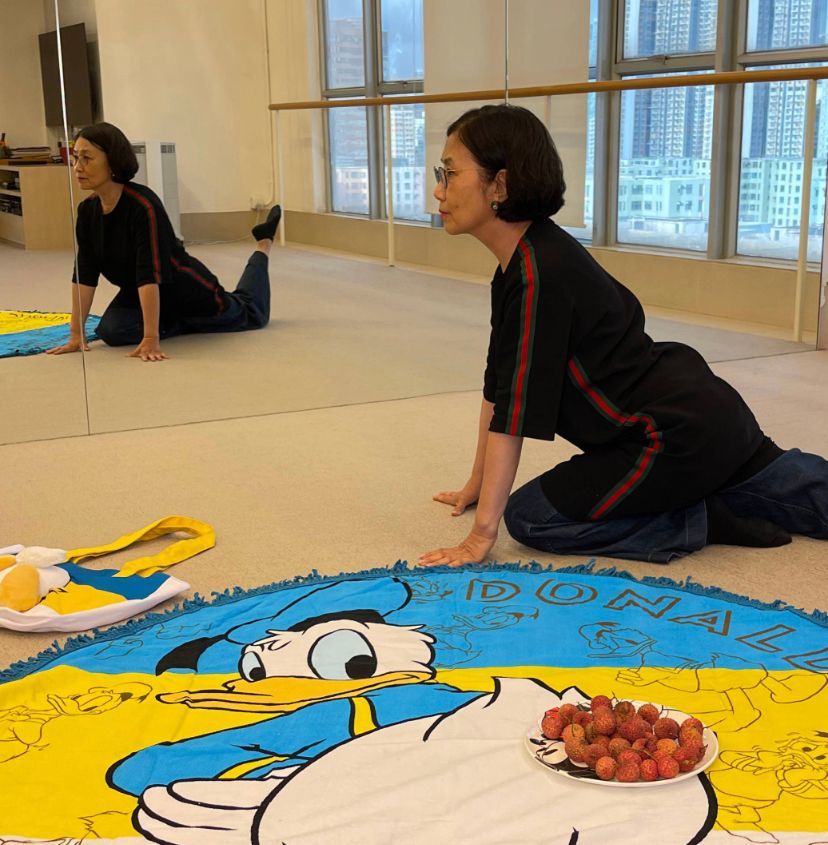 除了书法课,汪明荃还上瑜伽班。她很有童心,在舞蹈房摆上唐老鸭的卡通地垫,陪着自己练瑜伽。她的背锻炼得很挺拔,身体的柔韧度超好。