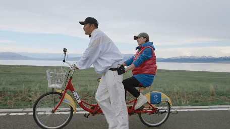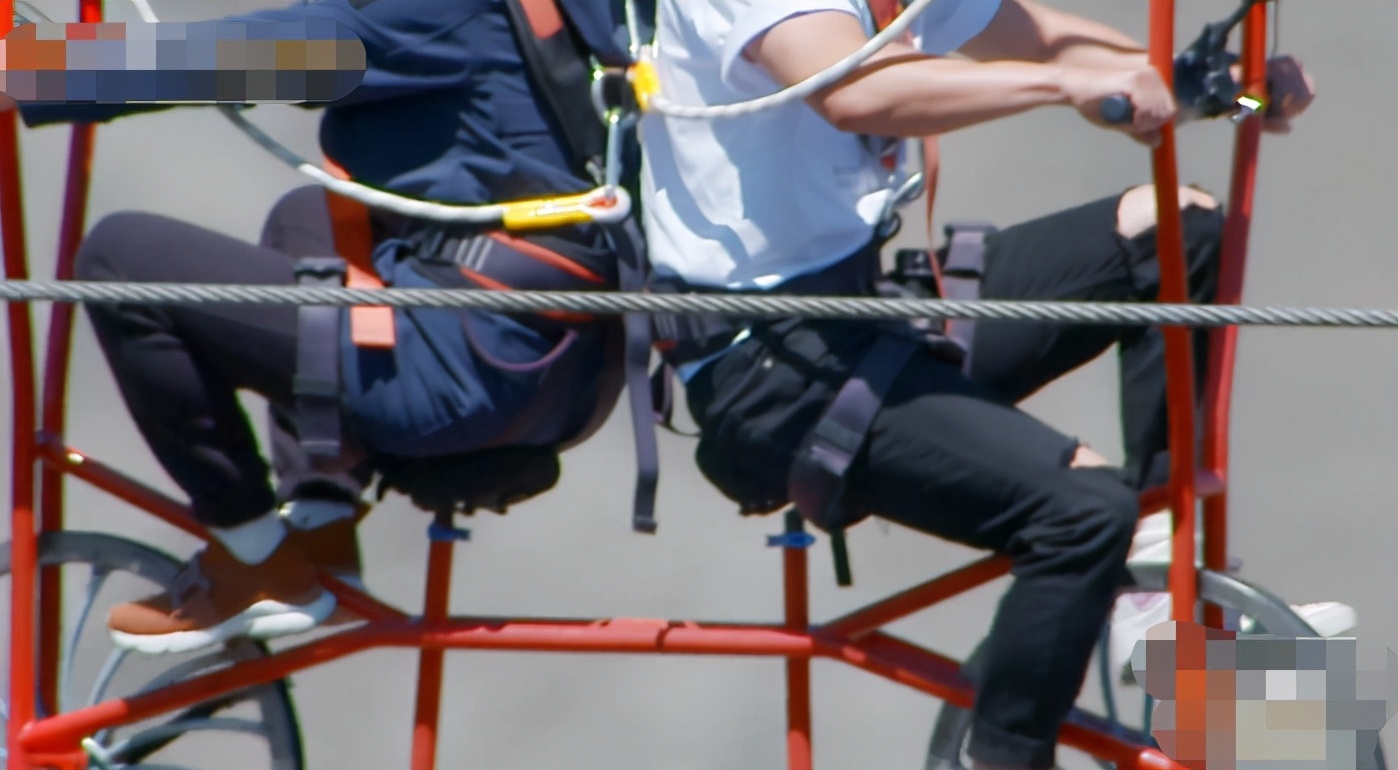 骑索道单车时,故意悬空双脚,让章贺一个人骑。