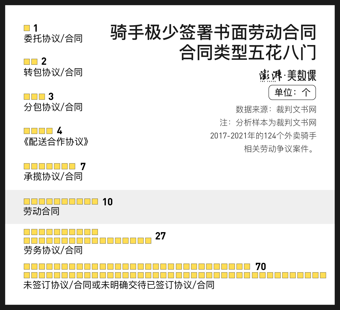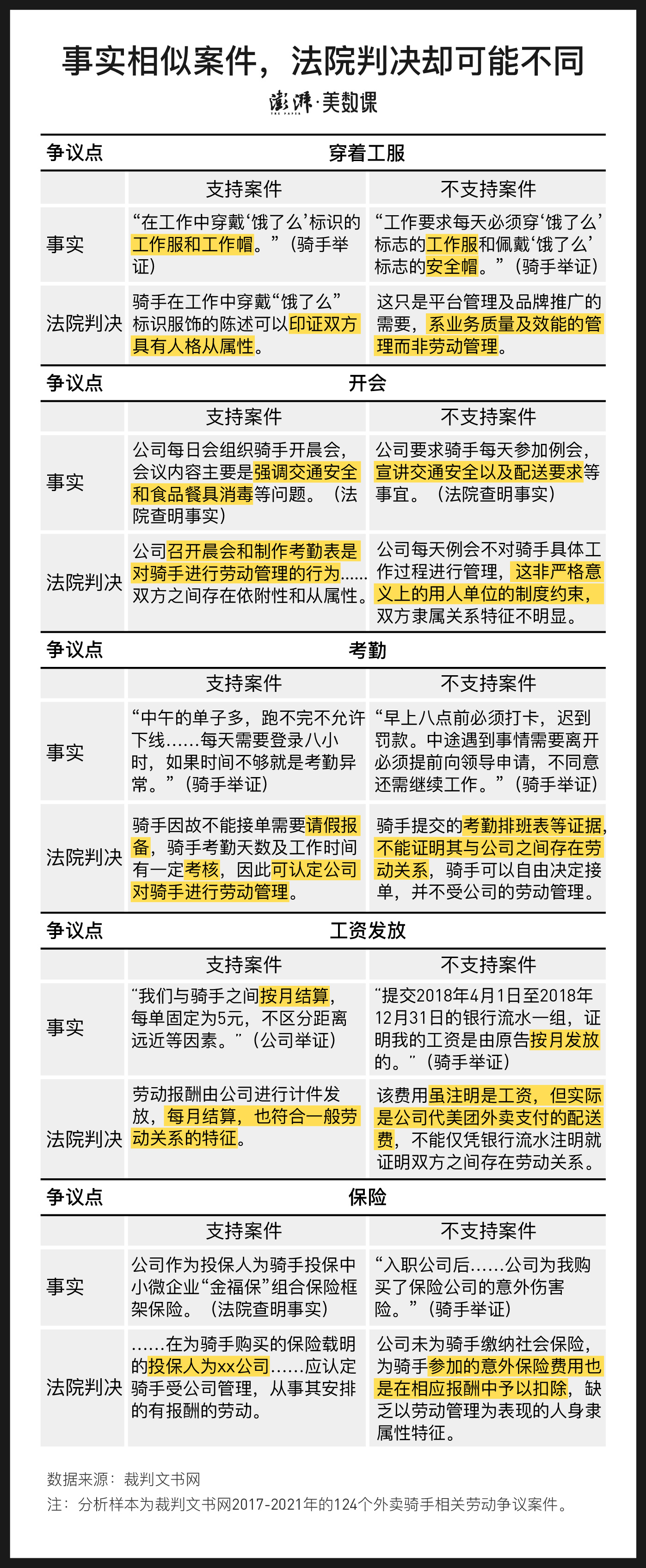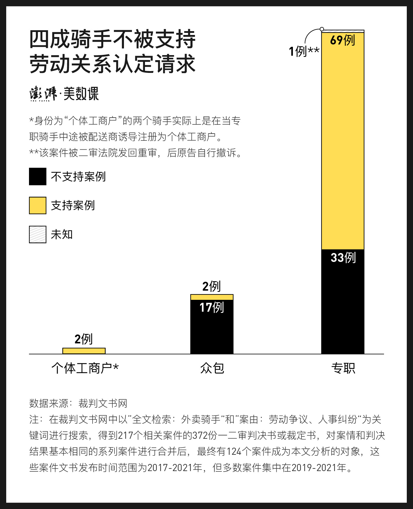 澎湃新闻以“外卖骑手”为全文检索关键词,对2017年至2021年间,124个以“劳动争议、人事纠纷”为案由的案件进行了分析。劳动关系得到认定的案件,占比为58.9%。但不同类型的骑手之间,劳动关系的认定情况存在较大的差异: