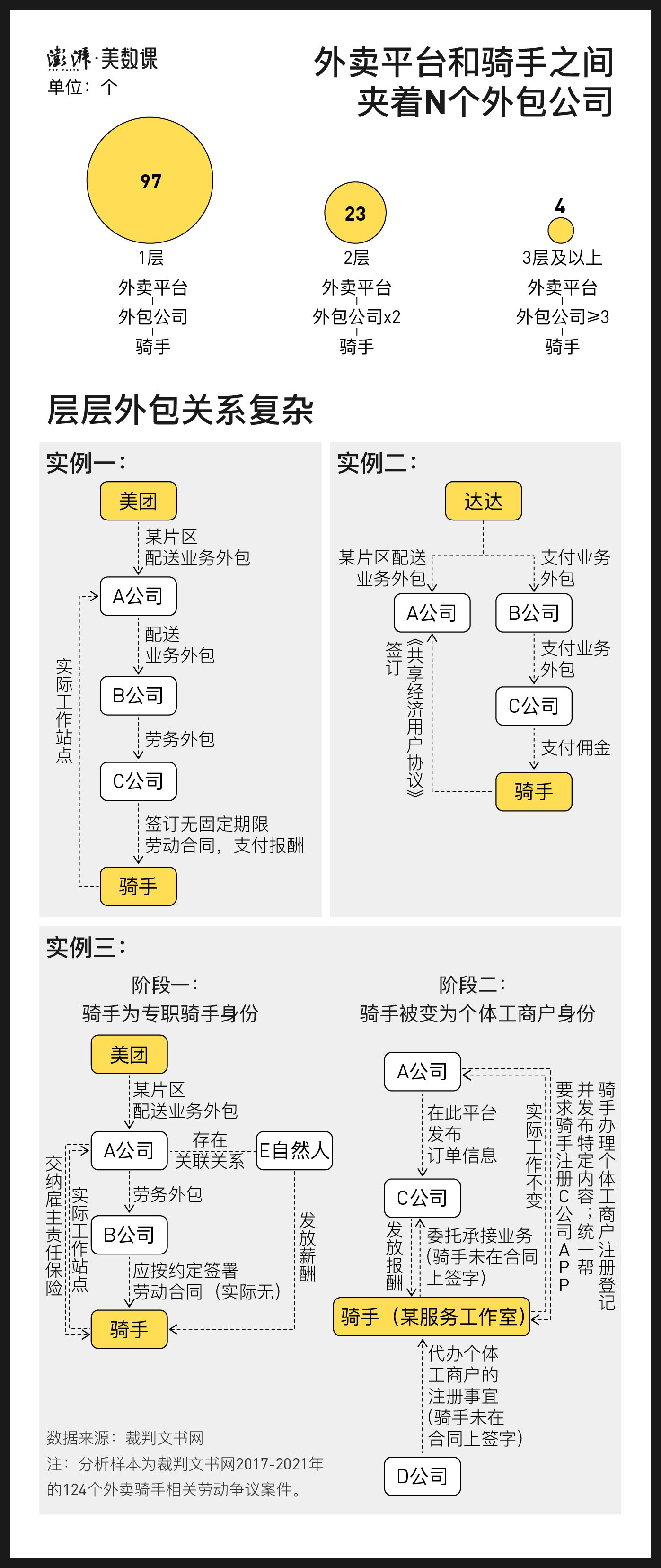 一些配送商则将业务拆分再外包,由此进一步分拆了骑手的合同签署对象、人身依附对象和经济依附对象,致使任何一个外包公司都不完全满足劳动关系认定要件。