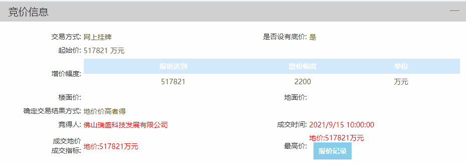 就在刚刚,禅城奇槎近9.4万㎡的定向挂牌商住地,被深圳鹏瑞以底价517821万拿下,折合成交楼面价约9194元/㎡!