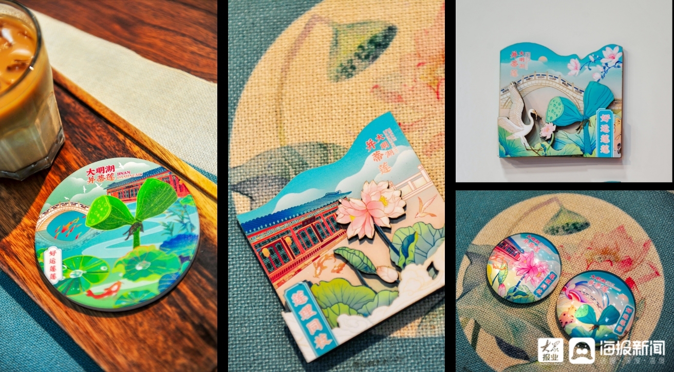 此外,大明湖畔完美绽放的并蒂莲,也成为文创灵感,被设计形成立体冰箱贴、水晶冰箱贴、书签和古风团扇等产品。其中,立体冰箱贴和水晶冰箱贴各有“大明湖”和“并蒂莲”两款。“大明湖”款以大明湖、并蒂莲蓬与鲤鱼荷花为元素,寓意连年有余,财源不断;“并蒂莲”款以并蒂莲、仙鹤、祥云为元素,有花开并蒂,喜庆、吉祥之意。而“好运莲莲”冰箱贴“步步生莲”冰箱贴文创书签,同样以并蒂莲为灵感,共有两款。一款以雨荷厅和并蒂莲蓬为元素,清新雅致;一款以并蒂莲花和凤鸟为元素,富贵吉祥。此外,“莲理同枝”书签古风团扇的设计灵感来源于“藕花深处田田叶,叶上初生并蒂莲”之句。扇面为大明湖中的并蒂莲,上有蜻蜓,契“早有蜻蜓立上头”之意。