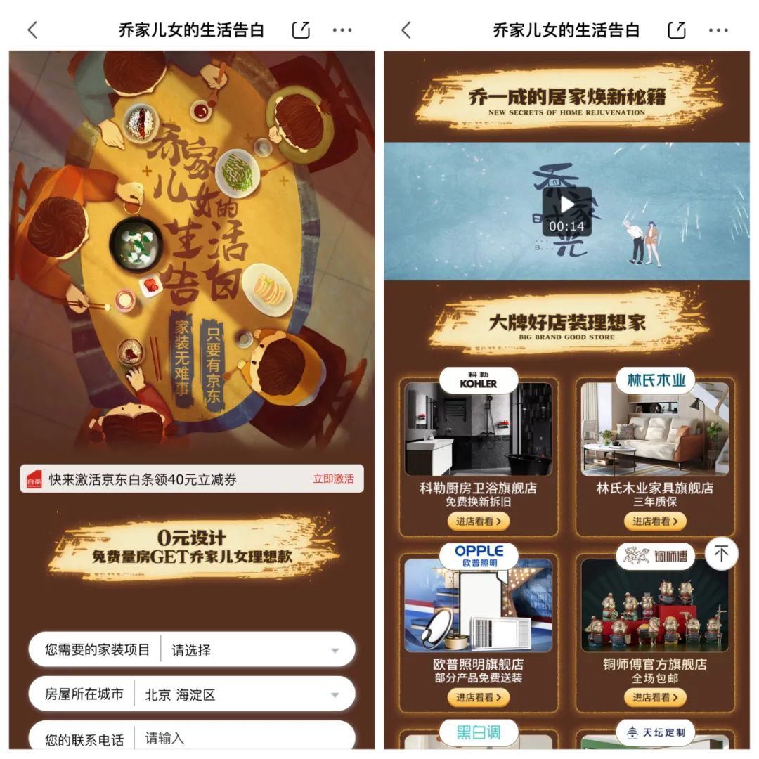 依托家庭剧所衍生的天然话题与场景,京东居家变身“乔家守护官”,主打“守护美好生活”。伴随用户观剧过程为品牌定制明星播报、如意贴等内容加场景的营销组合。通过“乔家大哥”乔一成的温暖演绎,以及剧中众多高光情节的深度绑定,沉浸式观感有效激发用户情感共鸣。