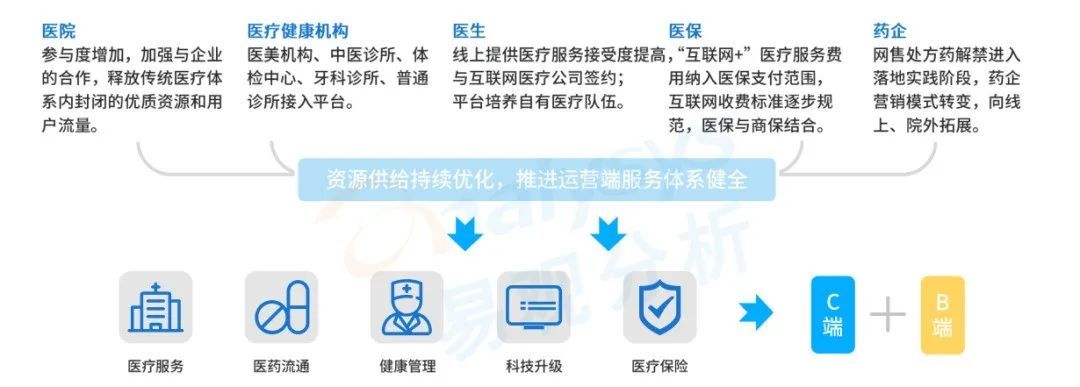 互联网医疗市场在政策的支持下,资源配置不断优化,为互联网医疗平台提供源源不断的支持。同时,互联网医疗平台也在持续挖掘和培养医疗资源,通过培养自有医疗队伍、开发AI辅助诊疗系统等完善服务体系,提升服务效率和质量。