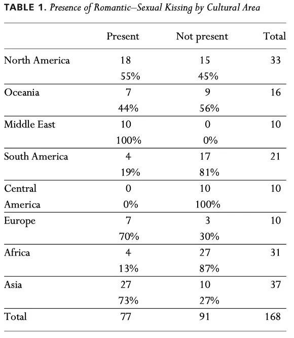 人类学家William Jankowiak等人(2015)通过研究发现,带有浪漫意味的接吻只出现在部分人类文化中。这项研究一共采样了来自世界八个地区的168个文化区域,但只有77个文化中出现了浪漫性接吻。