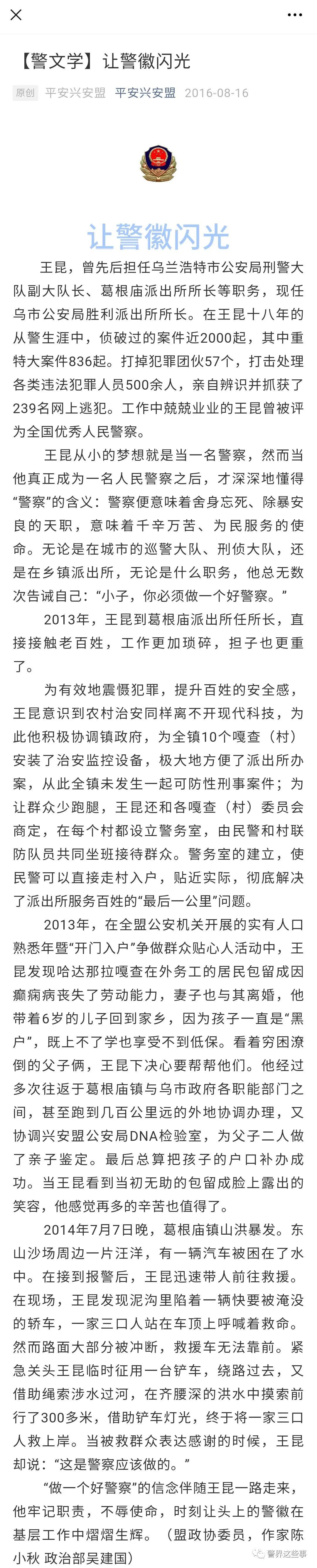 据媒体此前报道,王昆从小的梦想就是当一名警察,当他真正成为一名人民警察之后,无数次告诫自己:“小子,你必须做一个好警察。”