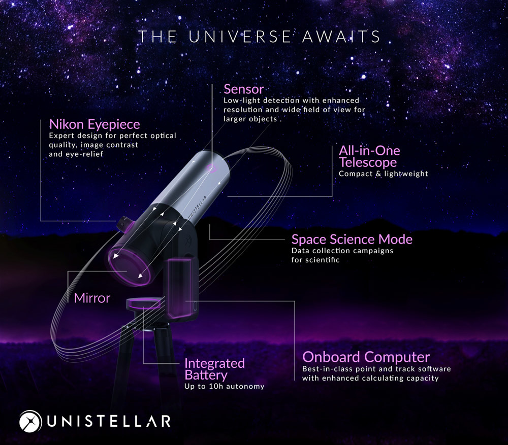eVscope 2是一款视场为34 x 47角分的单筒天文望远镜,搭载了一块3200 x 2400分辨率(770万像素)的传感器,拥有1.33角秒的分辨力,按照Unistellar官方说法,该望远镜拥有50倍光学放大率,数码放大率可以达到400倍,不过为了保证画质,建议不超过150倍。为了方便普通爱好者观察到小行星、系外行星、彗星、超新星等,望远镜内置了包含教育、培训、地理位置多种的信息应用,甚至能够直播观测效果,而且允许附近10个观察员同时连接望远镜。此外,望远镜内置64GB存储空间,充满电下能够使用10小时。