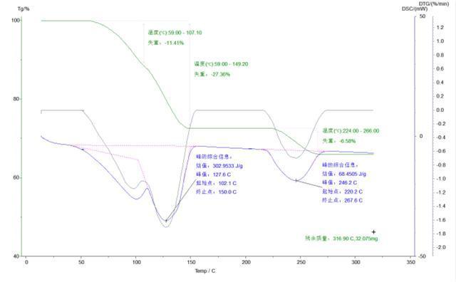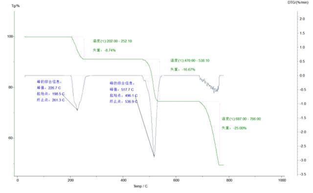 CaC2O4·H2O的热重曲线,有三个非常明显的失重阶段。第一个阶段表示水分子的失去,第二个阶段表示CaC2O4分解为CaCO3,第三个阶段表示CaCO3分解为CaO。当然,CaC2O4·H2O的热失重比较典型,在实际上许多物质的热重曲线很可能是无法如次明了地区分为各个阶段的,甚至会成为一条连续变化地曲线。这时,测定曲线在各个温度范围内的变化速率就显得格外重要,它是热重曲线的一阶导数,称为微分热重曲线,现示出了CaC2O4·H2O的微分热重曲线(DTG)。微分热重曲线能很好地显示这些速率地变化。