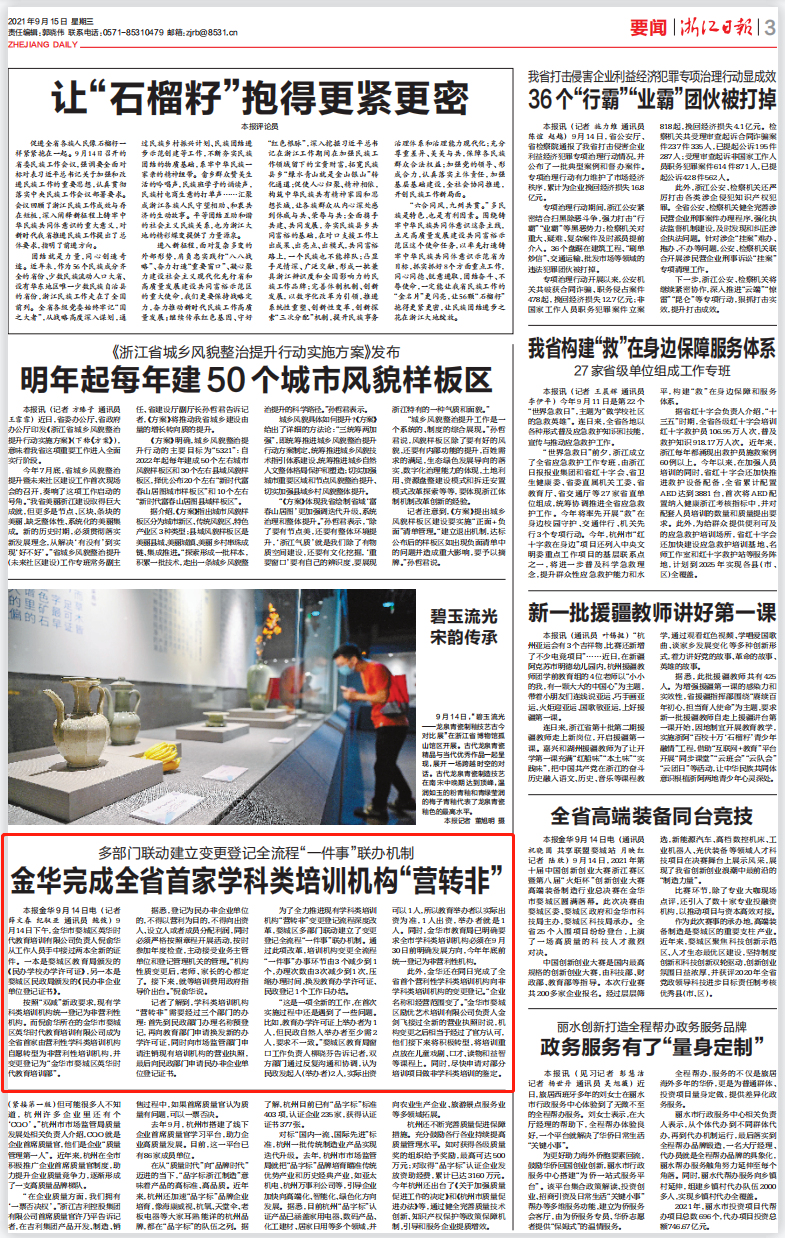 按照“双减”新政要求,现有学科类培训机构统一登记为非营利性机构。而倪俞华所在的金华市婺城区英华时代教育培训有限公司成为全省首家由营利性学科类培训机构自愿转型为非营利性培训机构,并变更登记为“金华市婺城区英华时代教育培训部”。