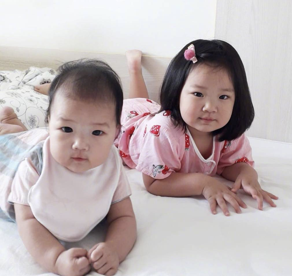 看照片,两姐妹眉眼各不相同,一个像爸爸,一个像妈妈,相同的是,两个女儿都继承了爸爸的大鼻子。